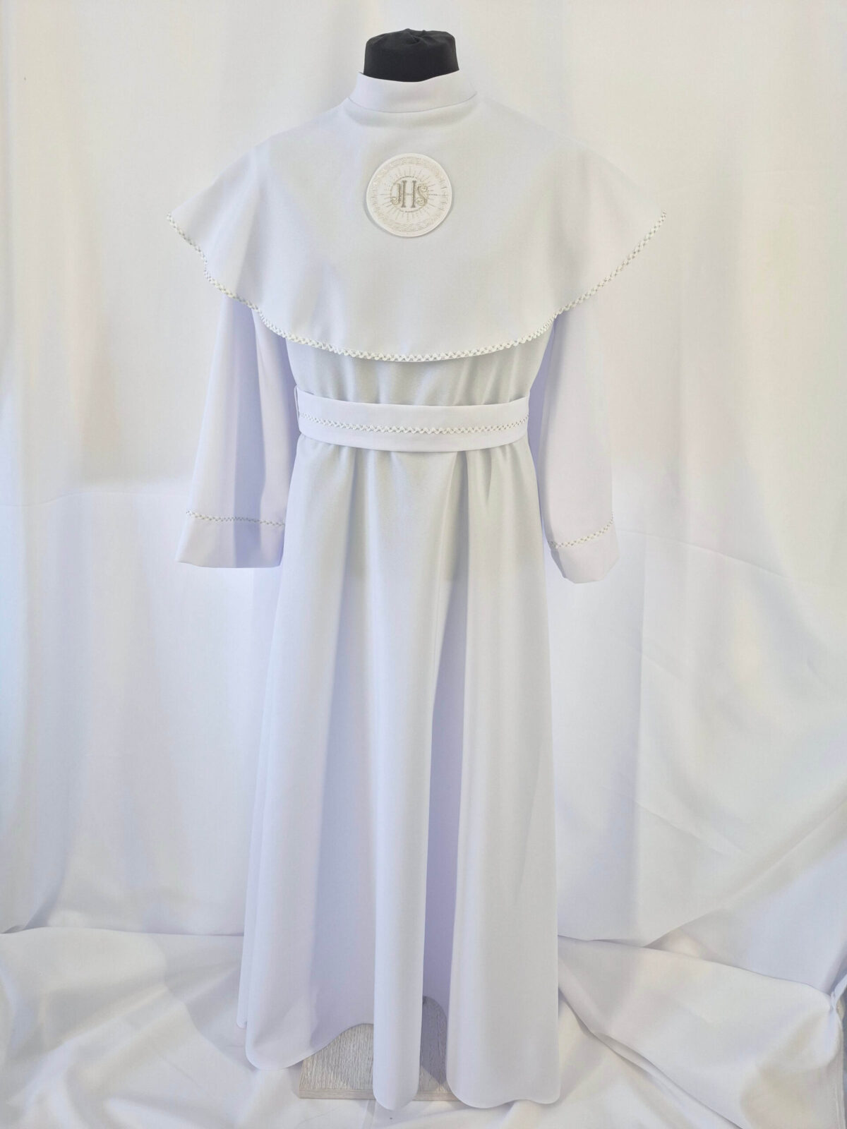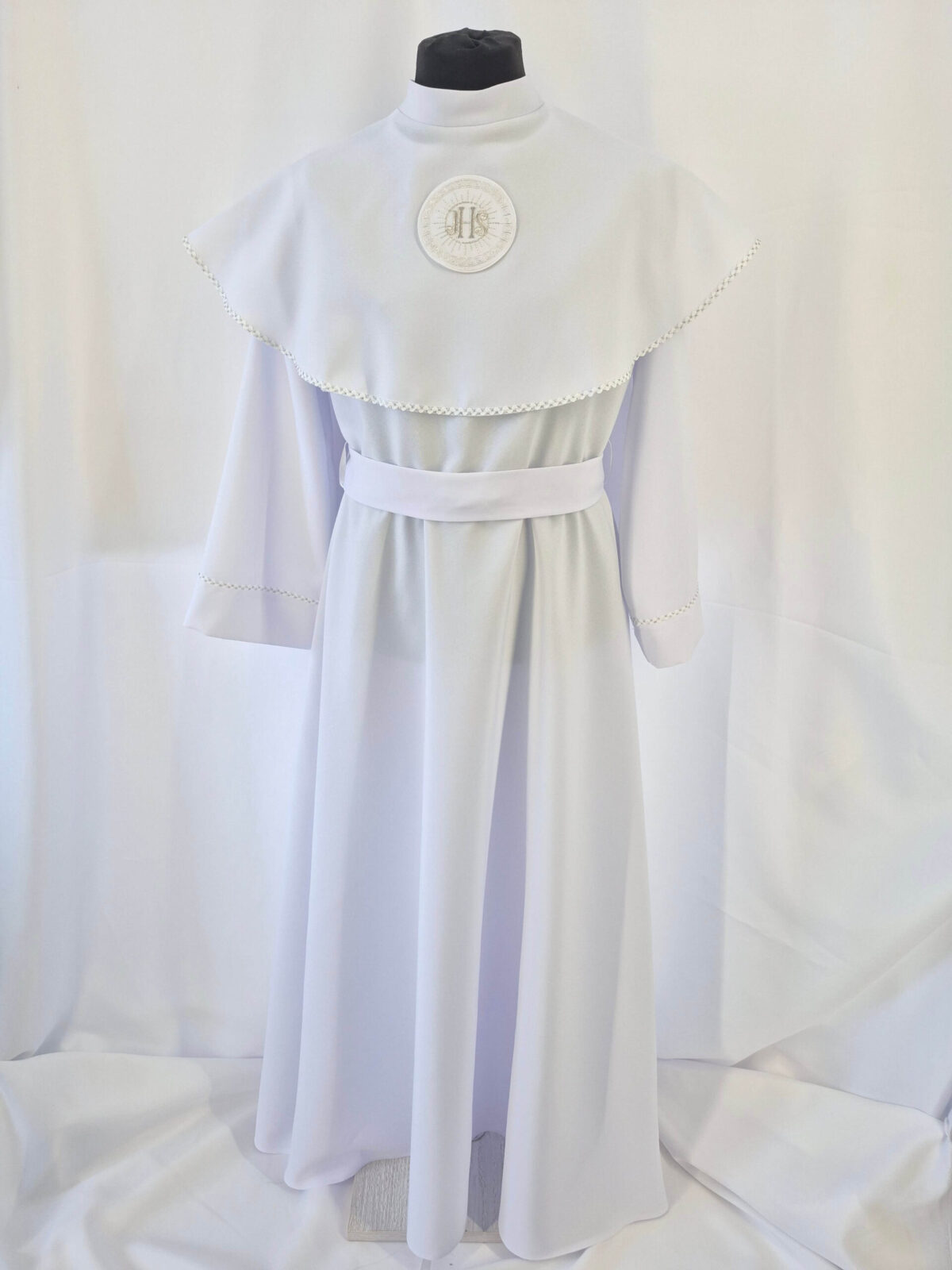 Alba sukienkowa to model ponadczasowy dla dziewczynek. Jest to model uszyty z odcięciem w pasie marszczonym gumką dla lepszego dopasowania oraz kołnierzem obszytym eleganckim zdobieniem i emblematem. To samo obszycie występuje na rękawach. Wykończenie alby stanowi pasek w zależności od Państwa wyboru.