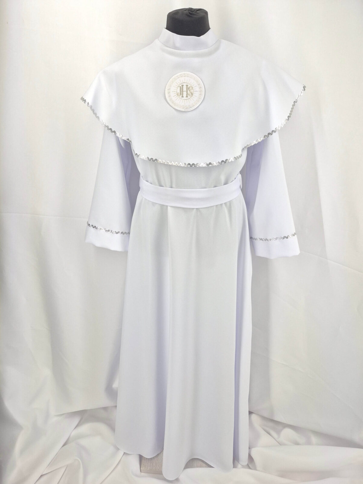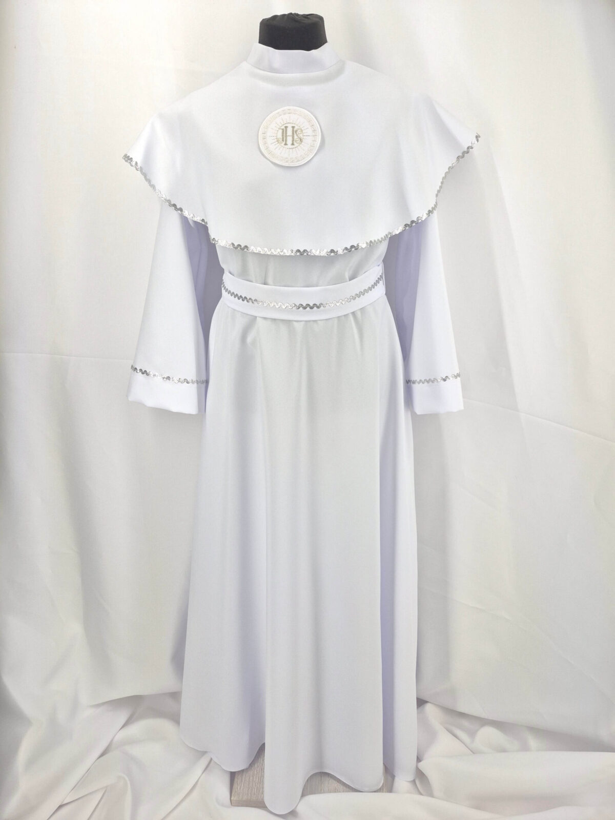 Alba sukienkowa to model ponadczasowy dla dziewczynek. Jest to model uszyty z odcięciem w pasie marszczonym gumką dla lepszego dopasowania oraz kołnierzem obszytym eleganckim zdobieniem i emblematem. To samo obszycie występuje na rękawach. Wykończenie alby stanowi pasek w zależności od Państwa wyboru.