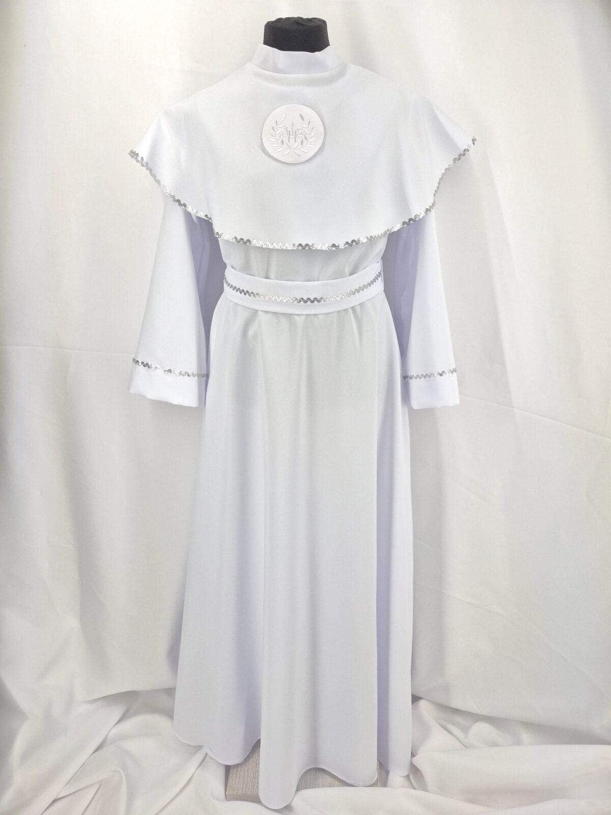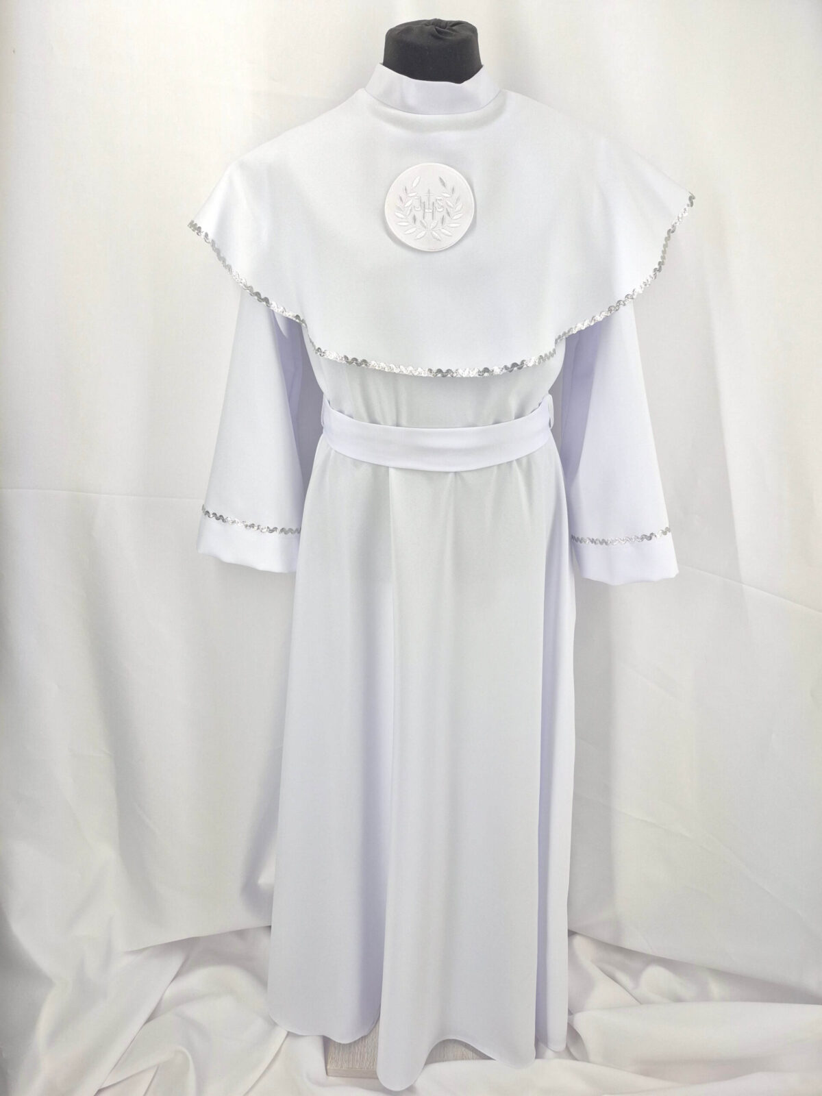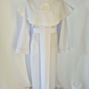 Alba sukienkowa to model ponadczasowy dla dziewczynek. Jest to model uszyty z odcięciem w pasie marszczonym gumką dla lepszego dopasowania oraz kołnierzem obszytym eleganckim zdobieniem i emblematem. To samo obszycie występuje na rękawach. Wykończenie alby stanowi pasek w zależności od Państwa wyboru.
