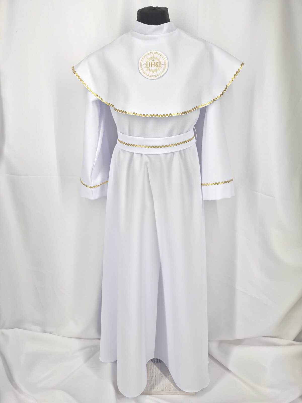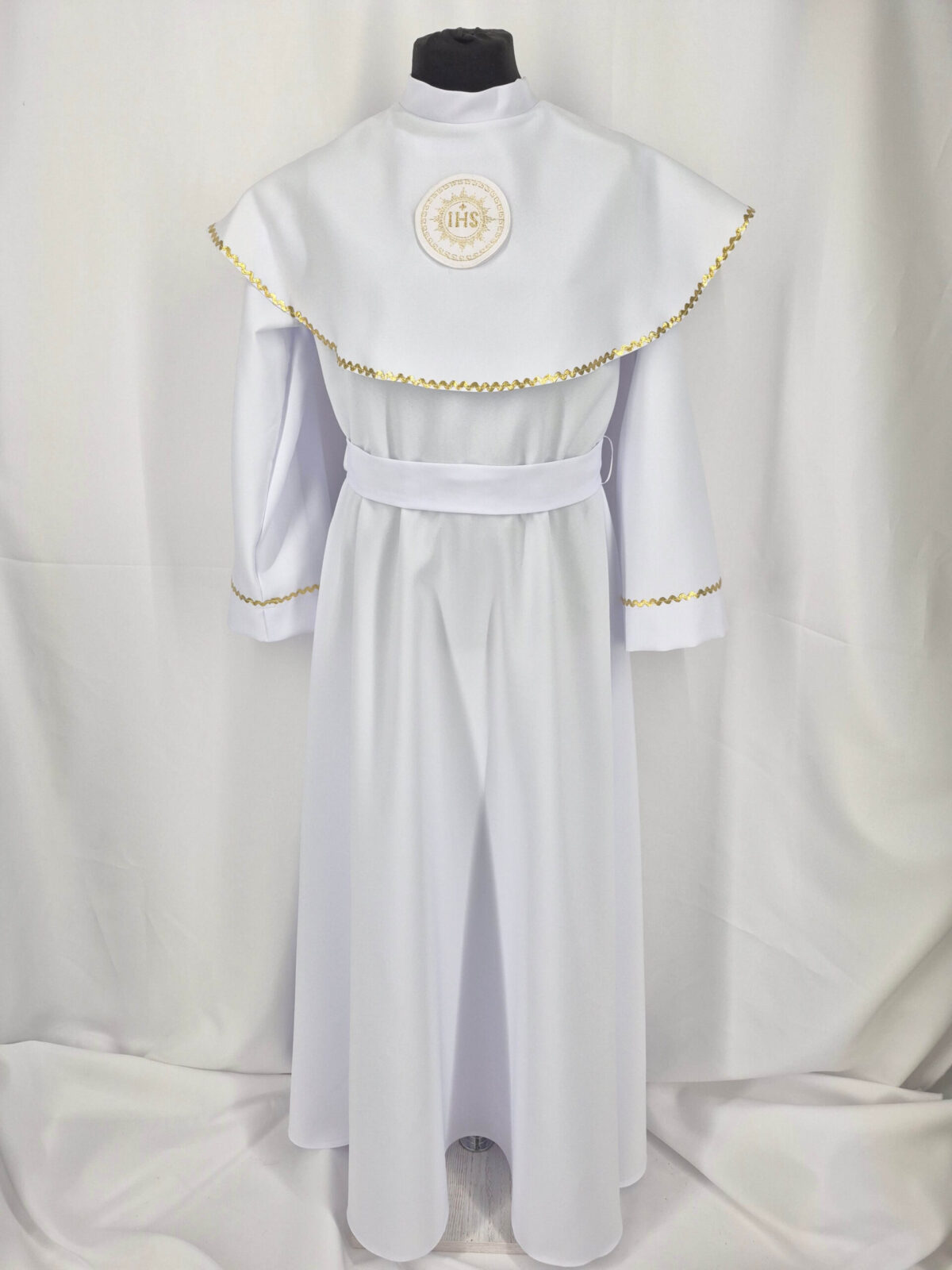 Alba sukienkowa to model ponadczasowy dla dziewczynek. Jest to model uszyty z odcięciem w pasie marszczonym gumką dla lepszego dopasowania oraz kołnierzem obszytym eleganckim zdobieniem i emblematem. To samo obszycie występuje na rękawach. Wykończenie alby stanowi pasek w zależności od Państwa wyboru.