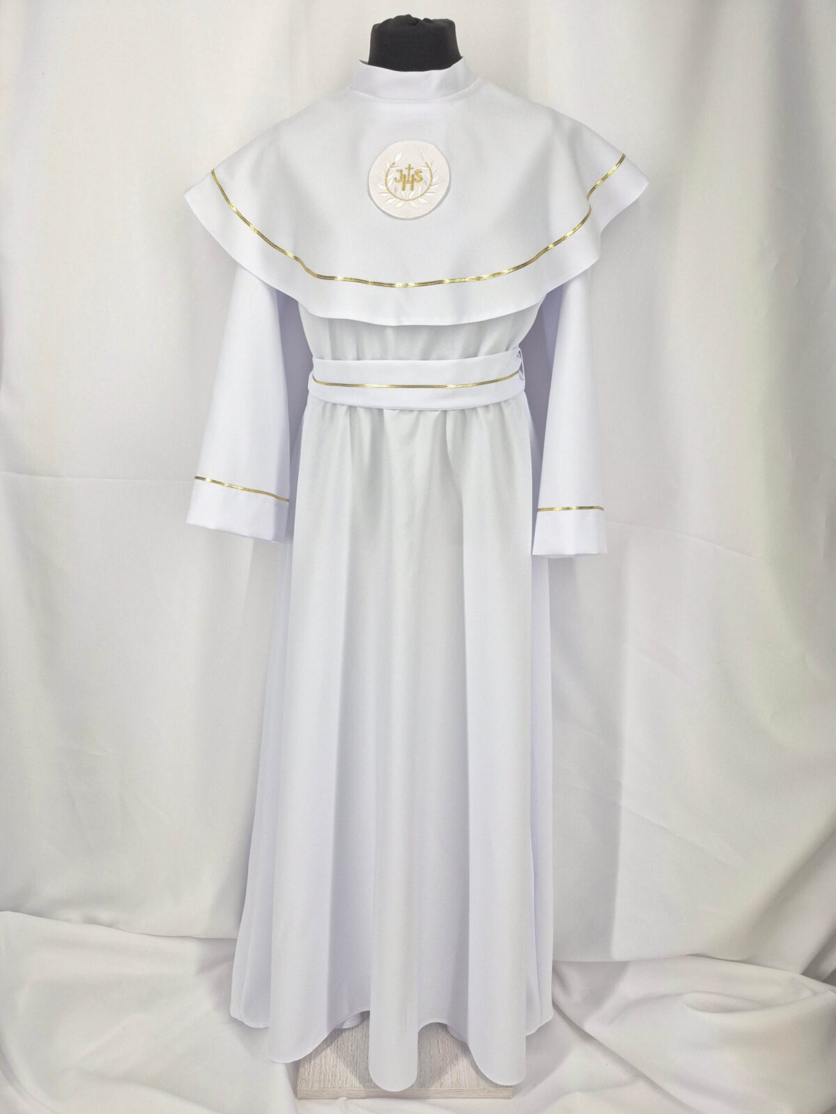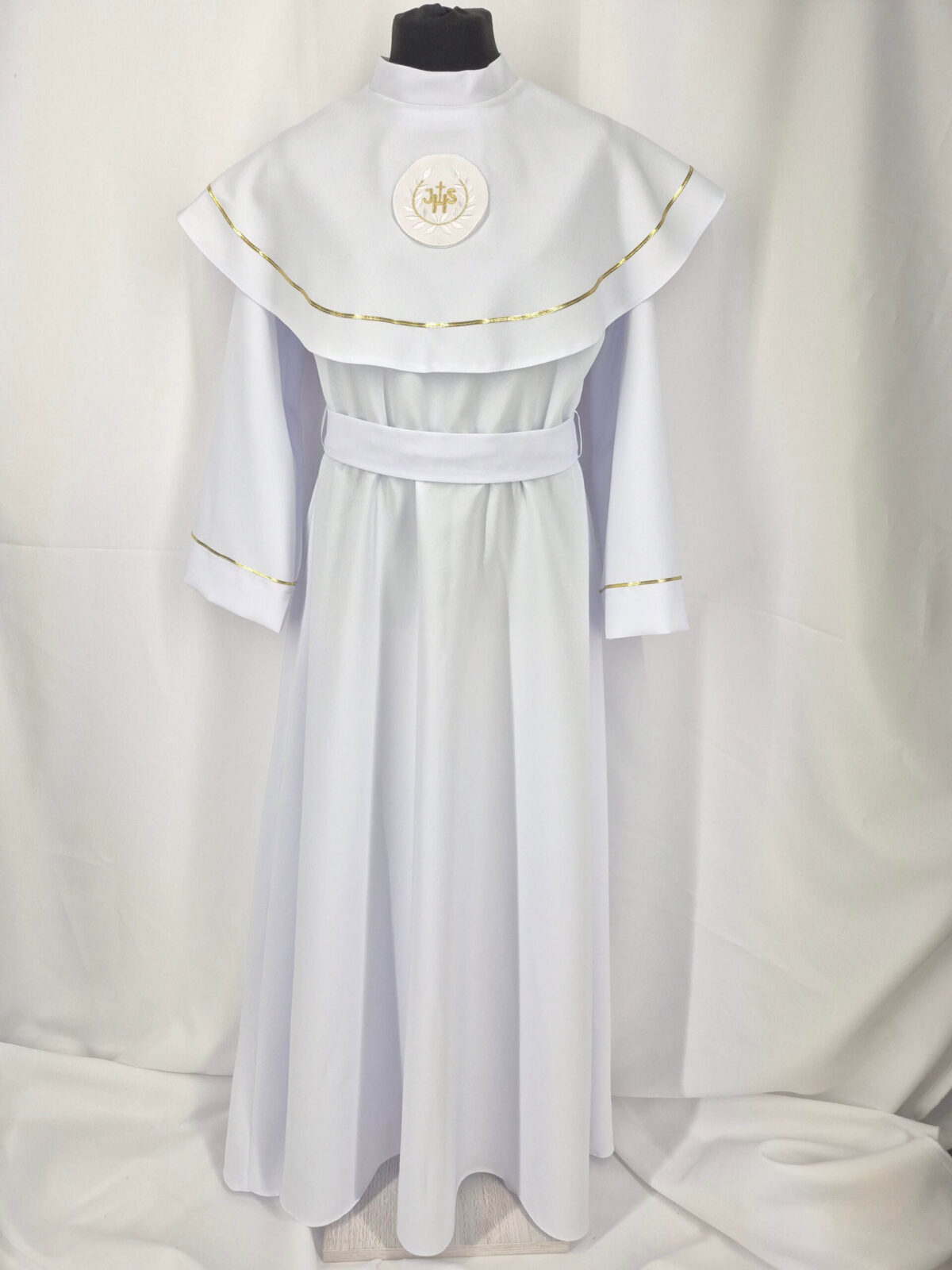 Alba sukienkowa to model ponadczasowy dla dziewczynek. Jest to model uszyty z odcięciem w pasie marszczonym gumką dla lepszego dopasowania oraz kołnierzem obszytym eleganckim zdobieniem i emblematem. To samo obszycie występuje na rękawach. Wykończenie alby stanowi pasek w zależności od Państwa wyboru.