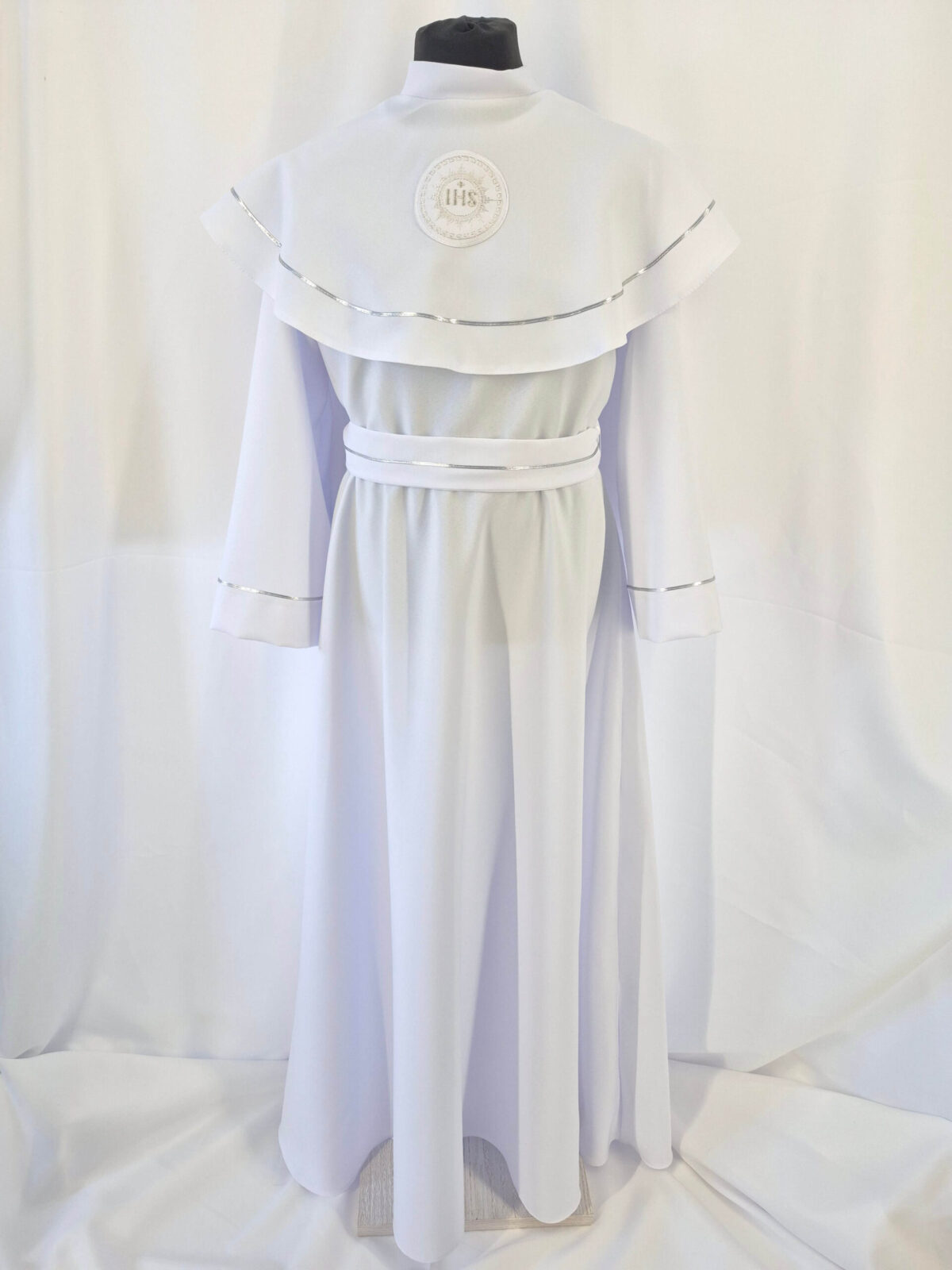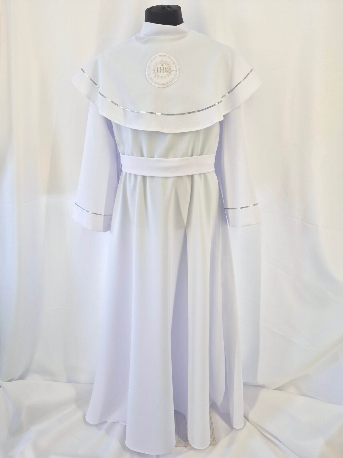Alba sukienkowa to model ponadczasowy dla dziewczynek. Jest to model uszyty z odcięciem w pasie marszczonym gumką dla lepszego dopasowania oraz kołnierzem obszytym eleganckim zdobieniem i emblematem. To samo obszycie występuje na rękawach. Wykończenie alby stanowi pasek w zależności od Państwa wyboru.