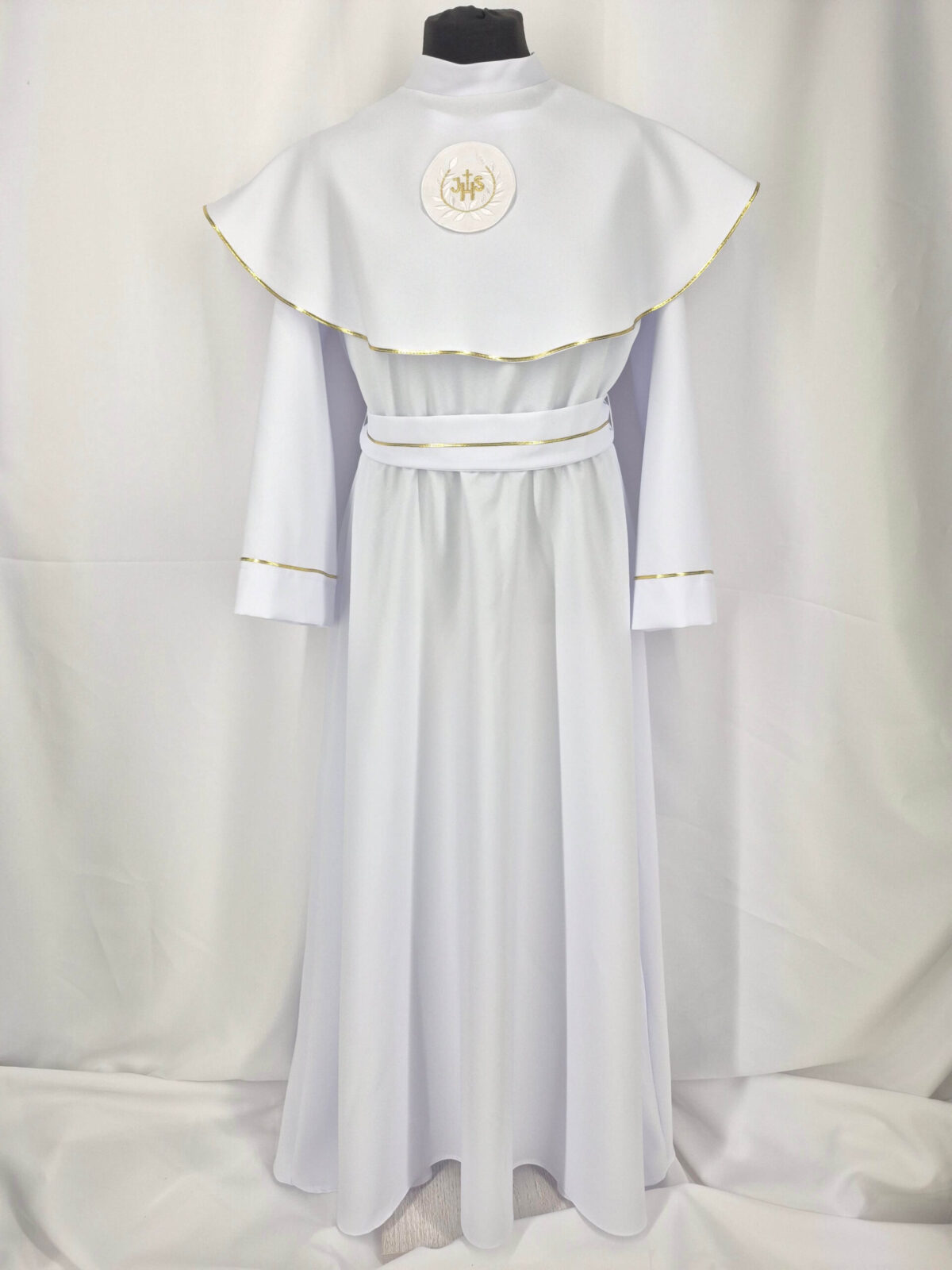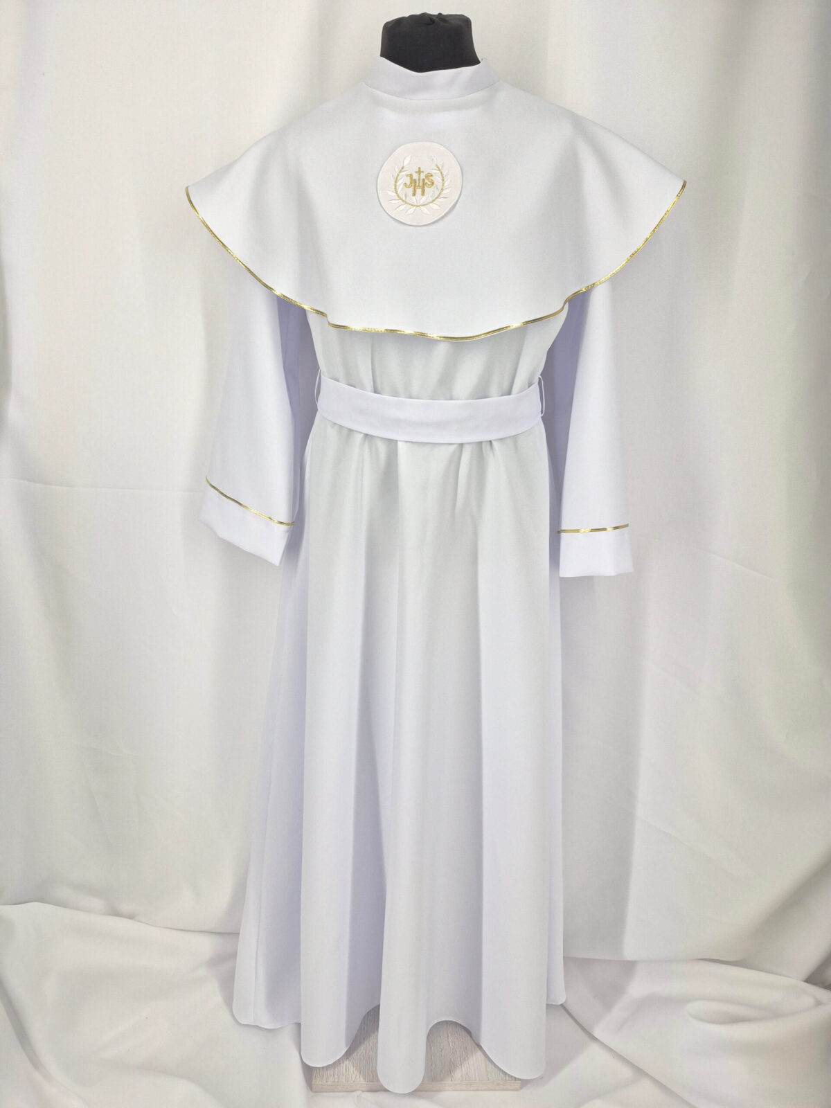 Alba sukienkowa to model ponadczasowy dla dziewczynek. Jest to model uszyty z odcięciem w pasie marszczonym gumką dla lepszego dopasowania oraz kołnierzem obszytym eleganckim zdobieniem i emblematem. To samo obszycie występuje na rękawach. Wykończenie alby stanowi pasek w zależności od Państwa wyboru.
