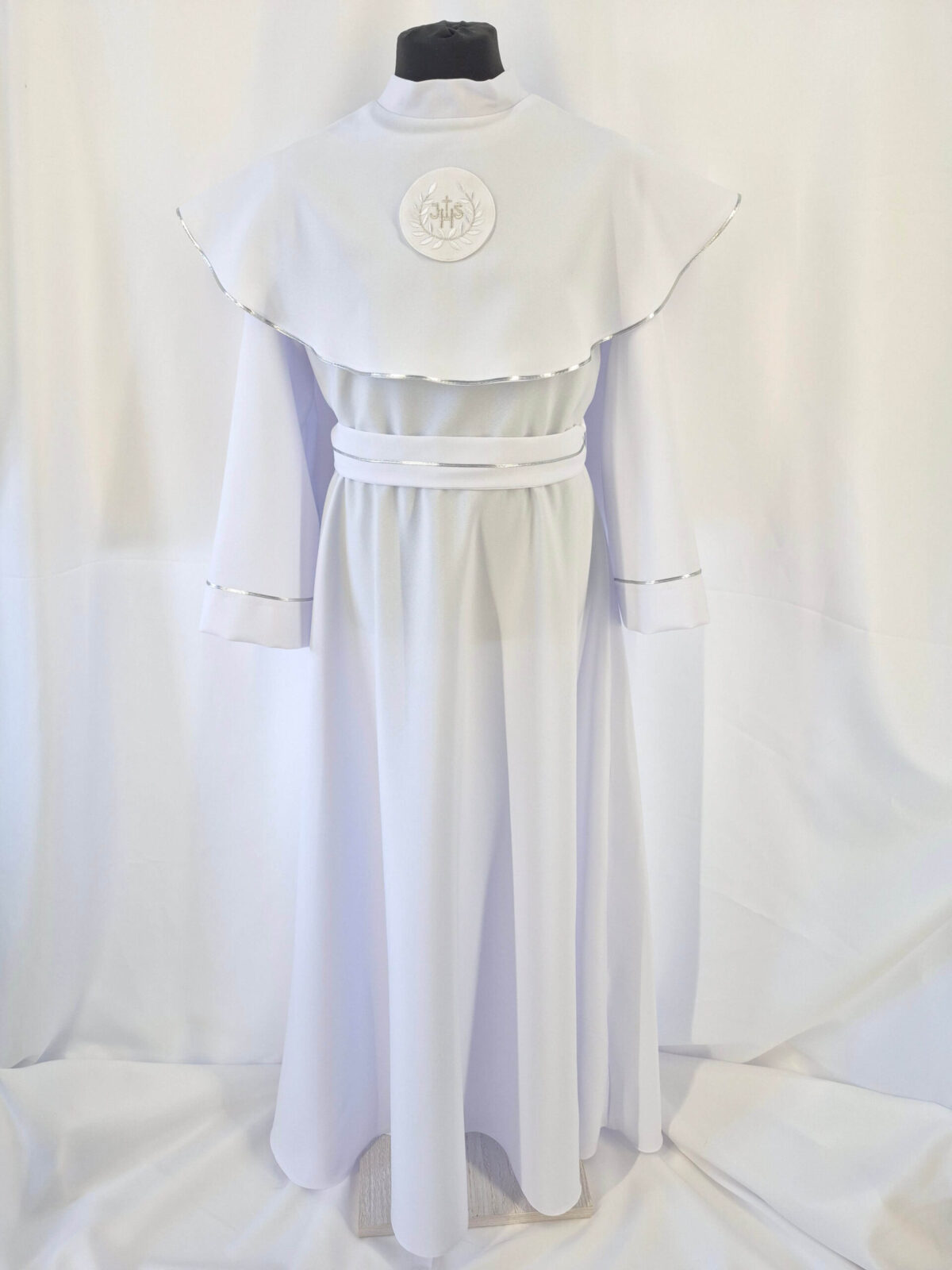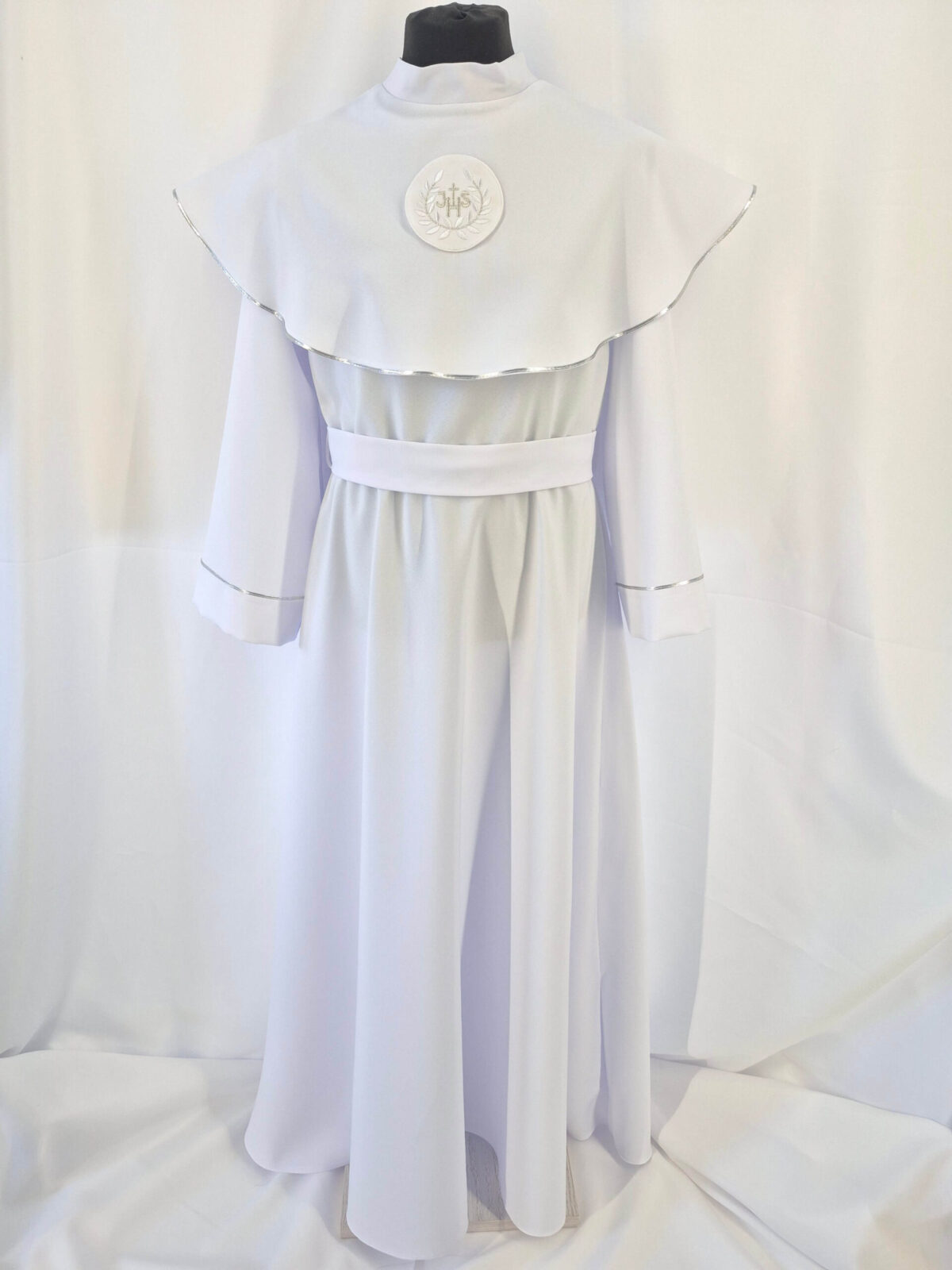 Alba sukienkowa to model ponadczasowy dla dziewczynek. Jest to model uszyty z odcięciem w pasie marszczonym gumką dla lepszego dopasowania oraz kołnierzem obszytym eleganckim zdobieniem i emblematem. To samo obszycie występuje na rękawach. Wykończenie alby stanowi pasek w zależności od Państwa wyboru.