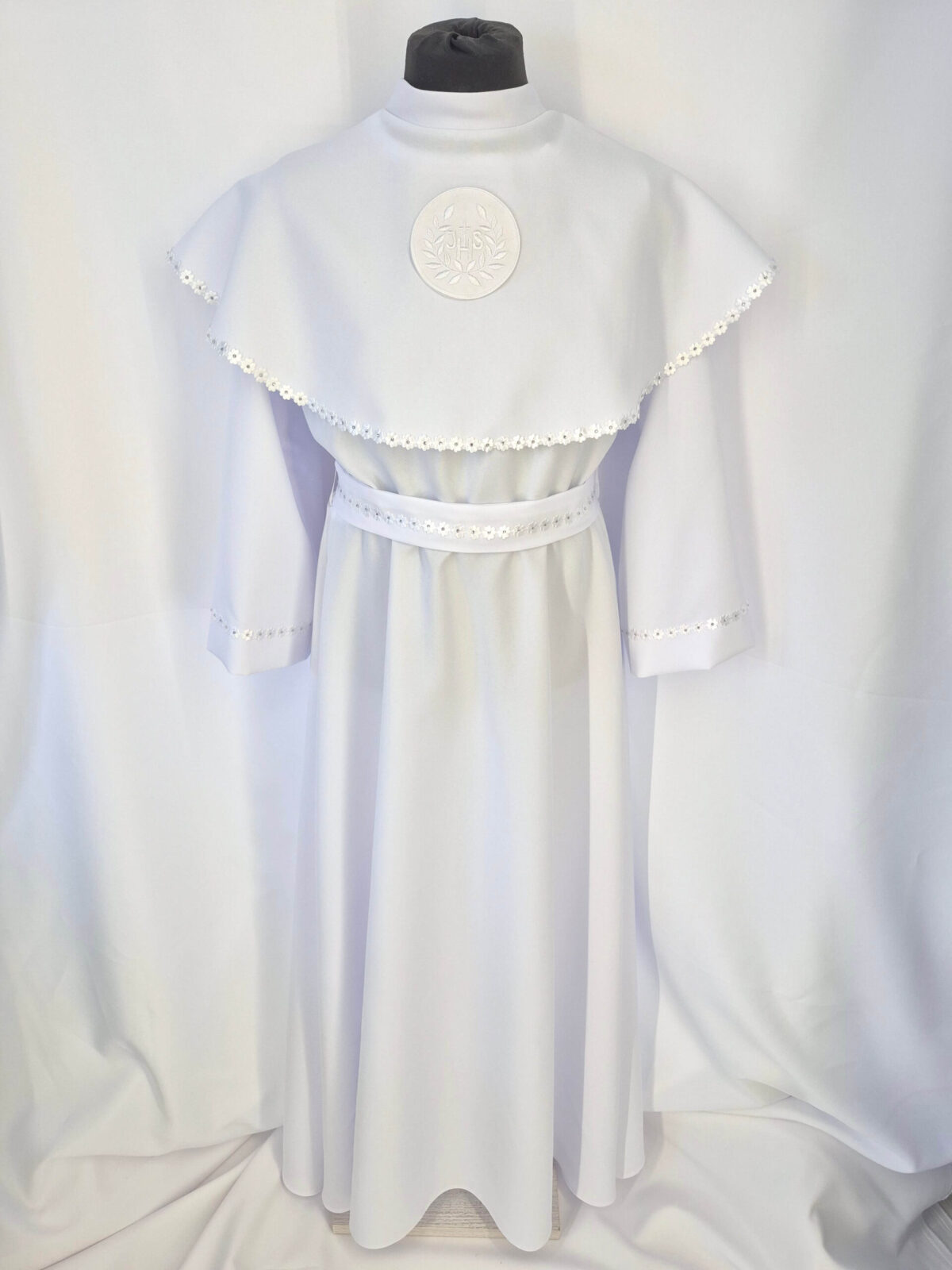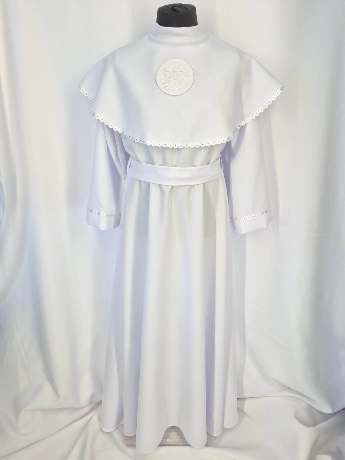 Alba sukienkowa to model ponadczasowy dla dziewczynek. Jest to model uszyty z odcięciem w pasie marszczonym gumką dla lepszego dopasowania oraz kołnierzem obszytym eleganckim zdobieniem i emblematem. To samo obszycie występuje na rękawach. Wykończenie alby stanowi pasek w zależności od Państwa wyboru.