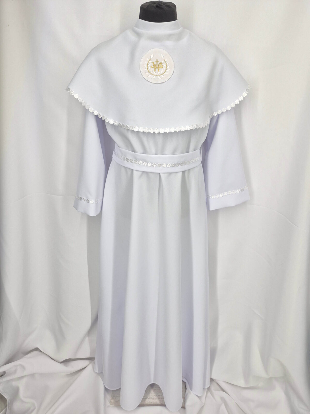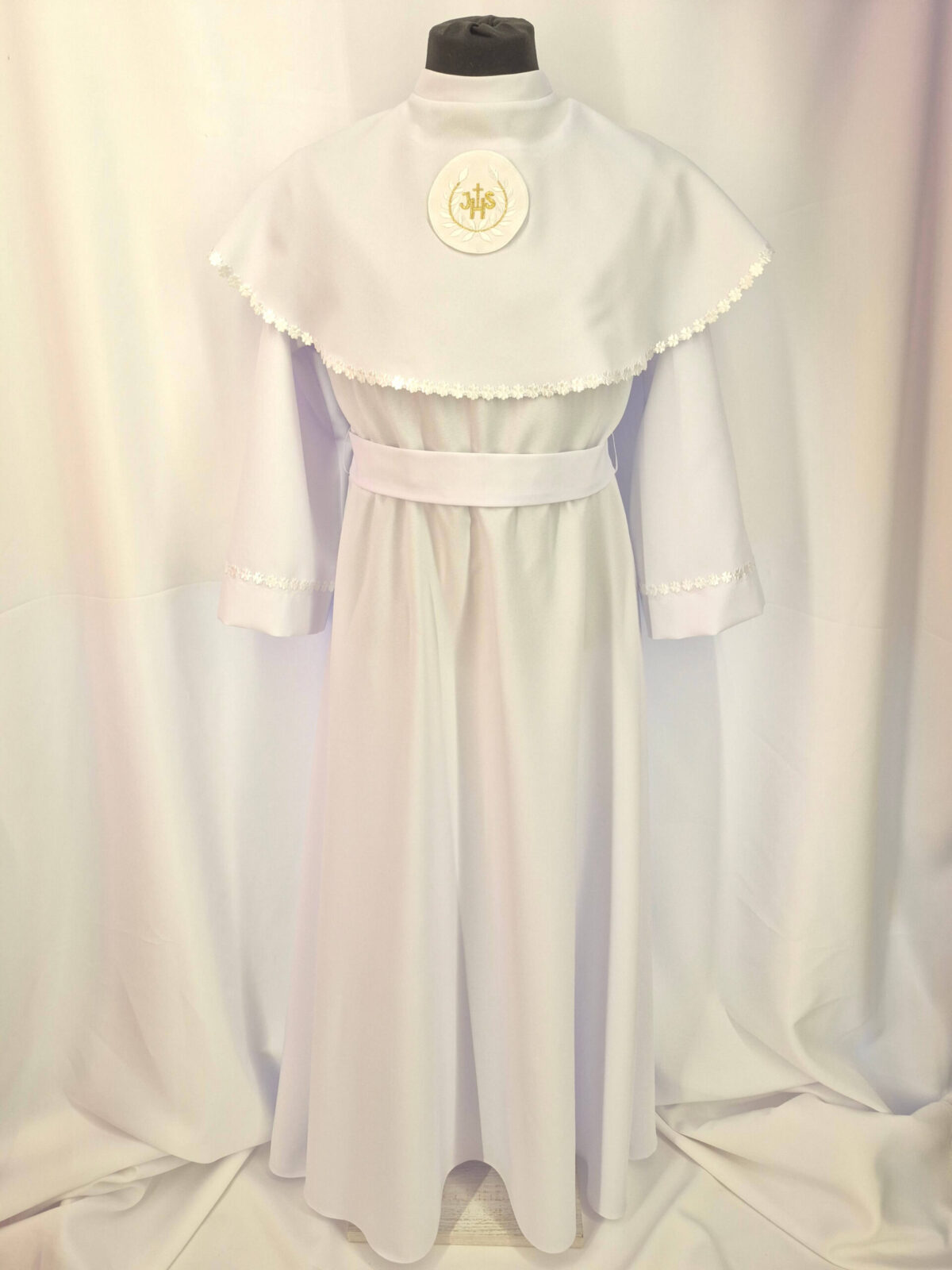 Alba sukienkowa to model ponadczasowy dla dziewczynek. Jest to model uszyty z odcięciem w pasie marszczonym gumką dla lepszego dopasowania oraz kołnierzem obszytym eleganckim zdobieniem i emblematem. To samo obszycie występuje na rękawach. Wykończenie alby stanowi pasek w zależności od Państwa wyboru.