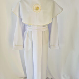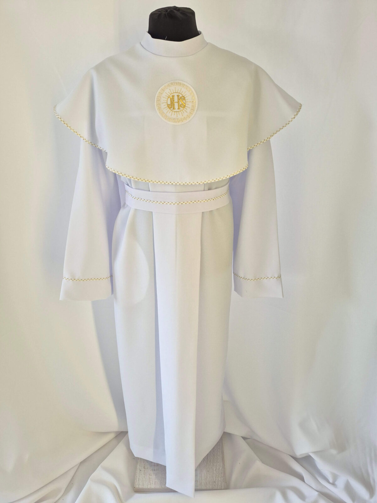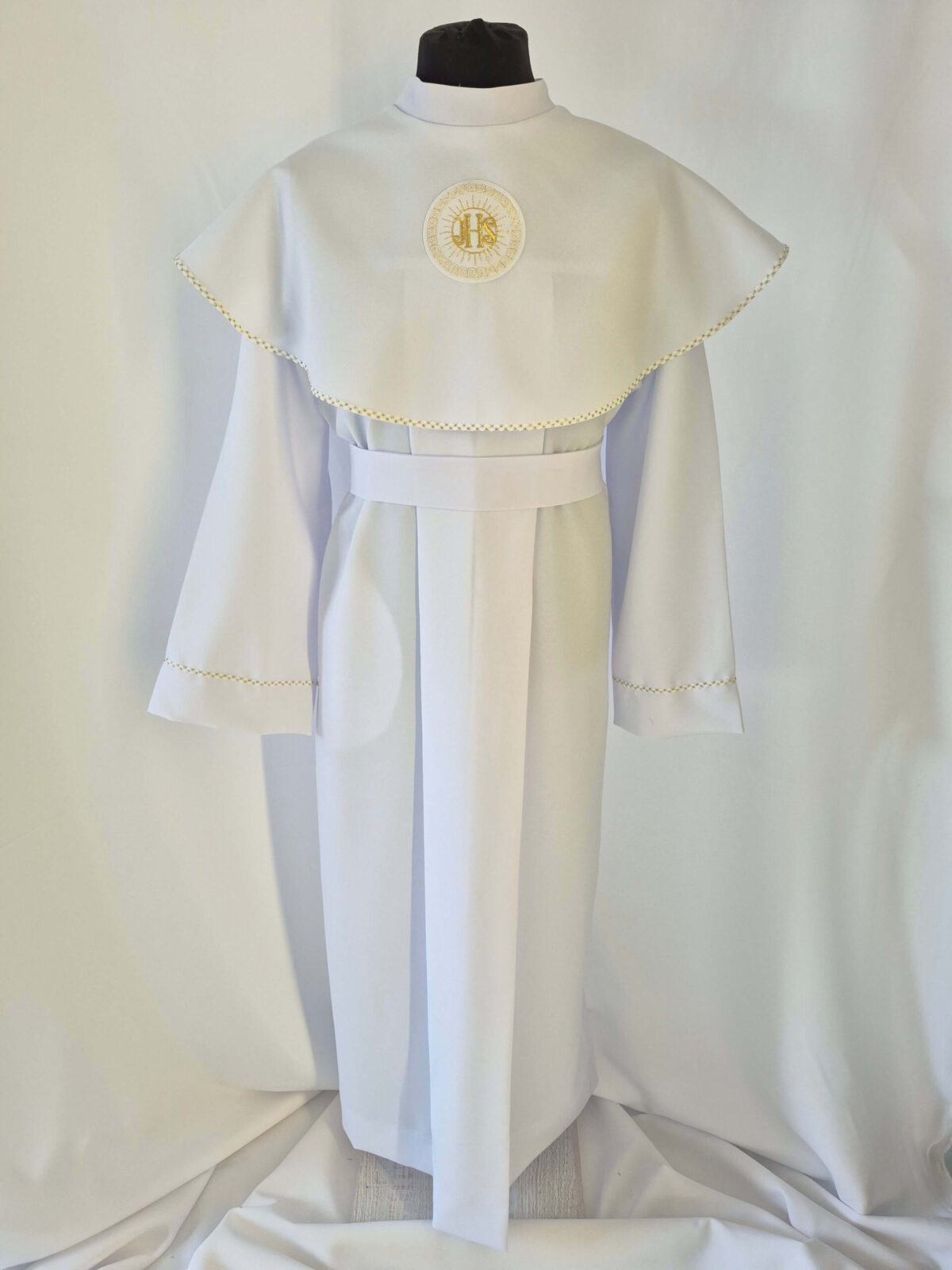 Alba tradycyjna to model ponadczasowy, który idealnie pasuje zarówno dla chłopców jak i dziewczynek. Jest to model uszyty z kontrfałdą z przodu i z tyłu alby oraz kołnierzem obszytym eleganckim zdobieniem i emblematem. To samo obszycie występuje na rękawach. Wykończenie alby stanowi biało-złoty sznurek lub pasek w zależności od Państwa wyboru.