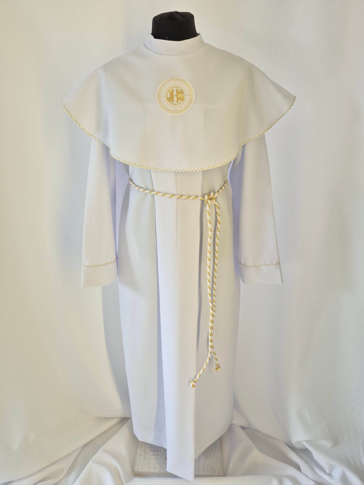 Alba uszyta jest z tkaniny stretch i zdobiona emblematem zgodnie z konkretnym modelem alby. Sznurek dobieramy kolorystycznie do obszycia i emblematu (jak na zdjęciu podglądowym). Za dodatkową opłatę doliczoną do zamówienia zamiast sznurka szyjemy pasek. Jeśli chcieliby Państwo wprowadzić jakieś zmiany do modelu prosimy o kontakt telefoniczny przed złożeniem zamówienia.Dostosujemy model według Państwa życzenia.