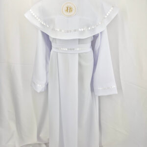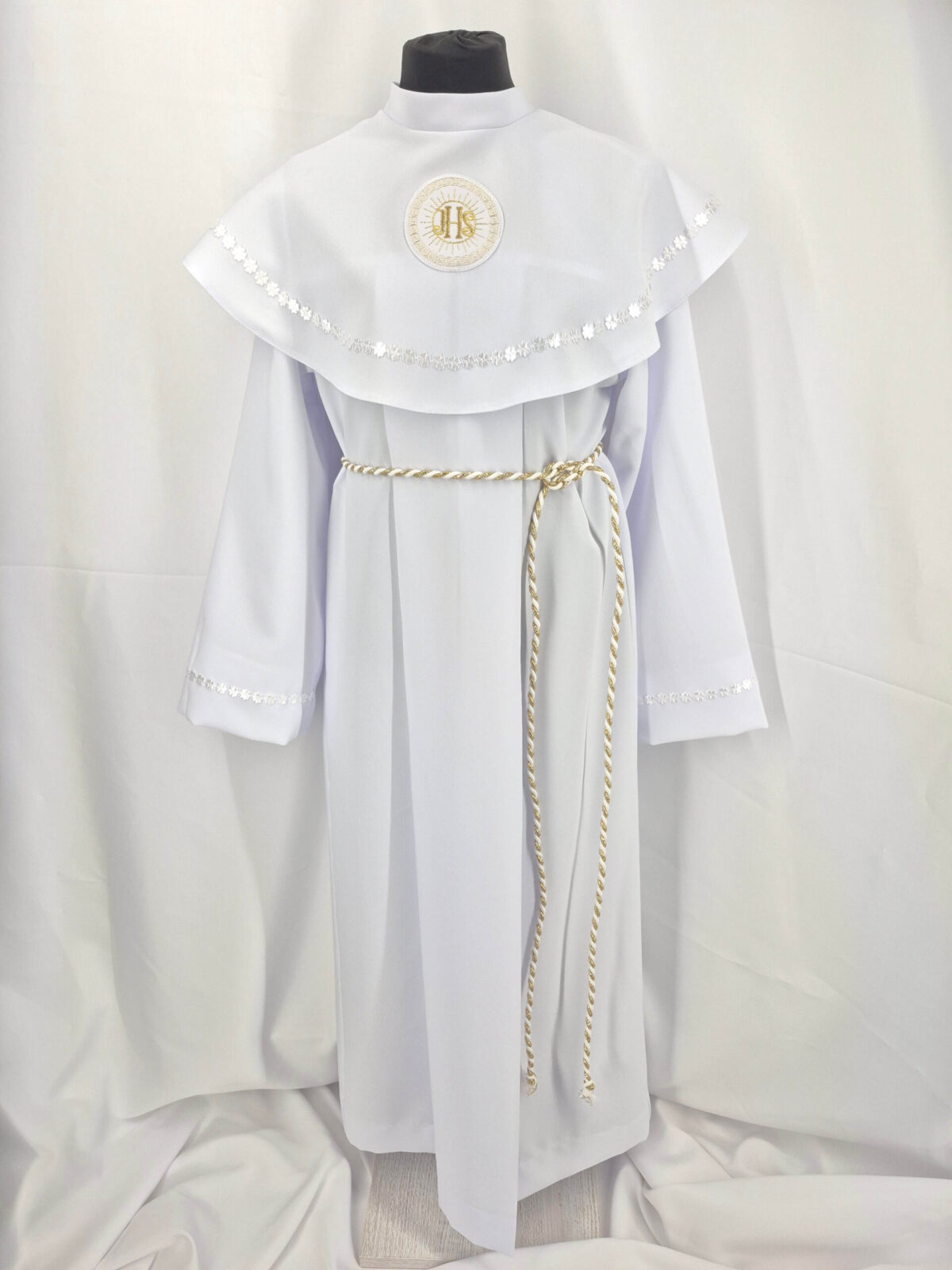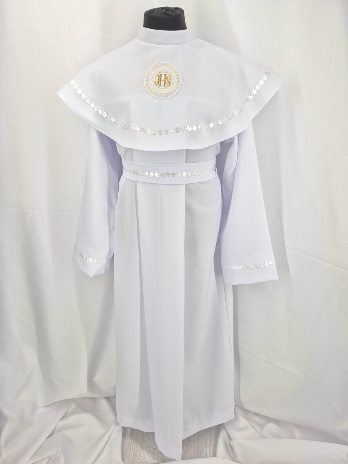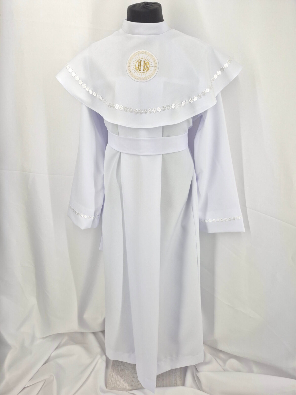 Alba tradycyjna to model ponadczasowy, który idealnie pasuje zarówno dla chłopców jak i dziewczynek. Jest to model uszyty z kontrfałdą z przodu i z tyłu alby oraz kołnierzem obszytym eleganckim zdobieniem i emblematem. To samo obszycie występuje na rękawach. Wykończenie alby stanowi biało-złoty sznurek lub pasek w zależności od Państwa wyboru.