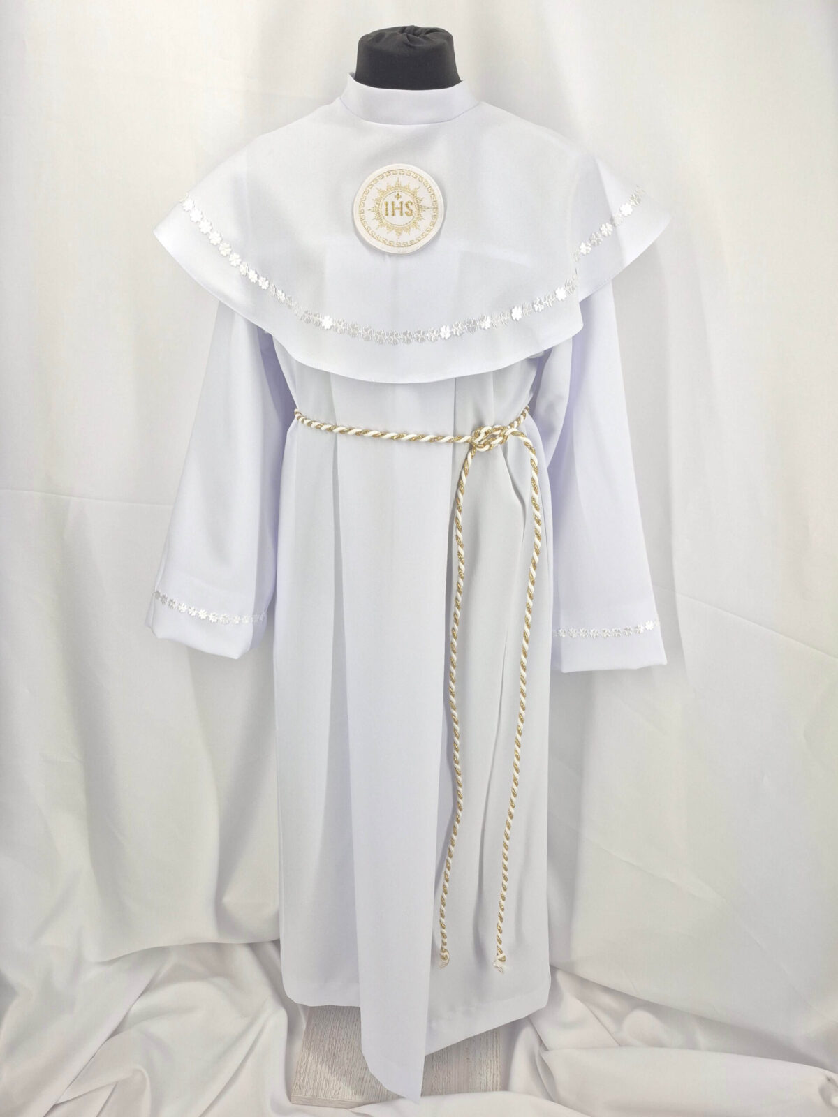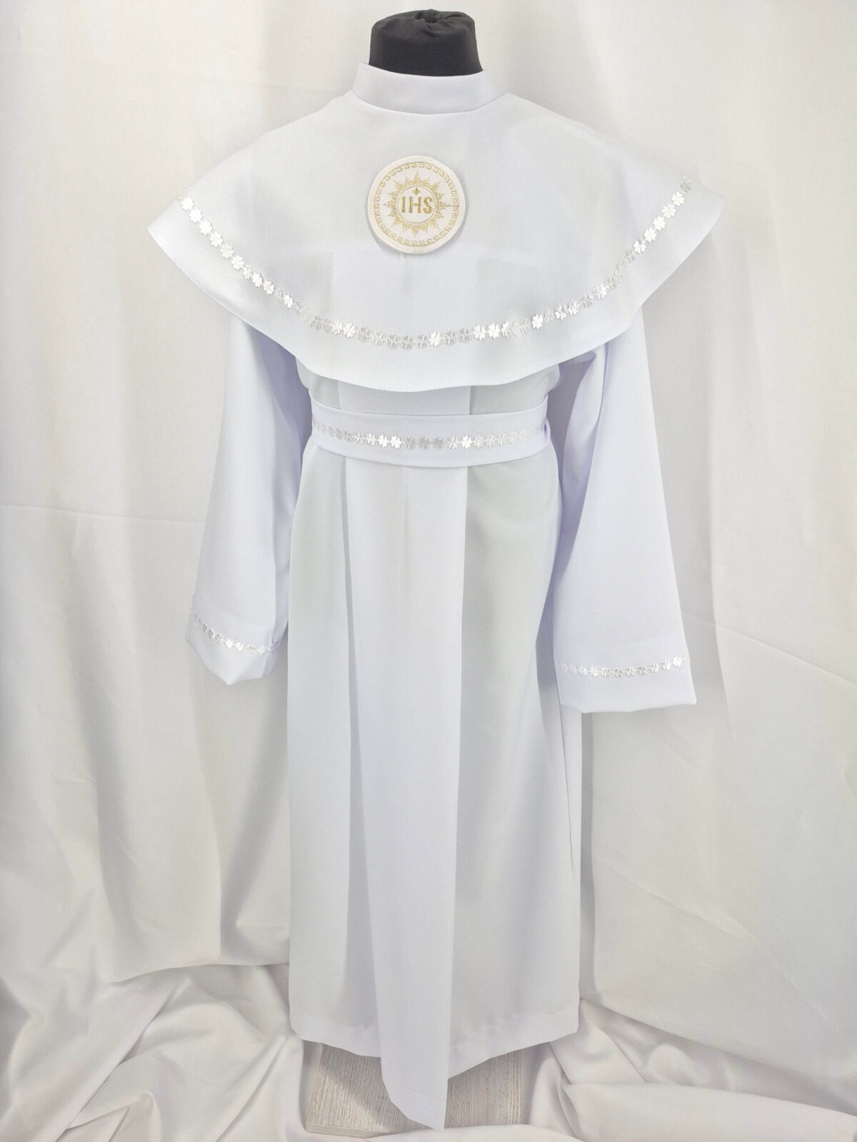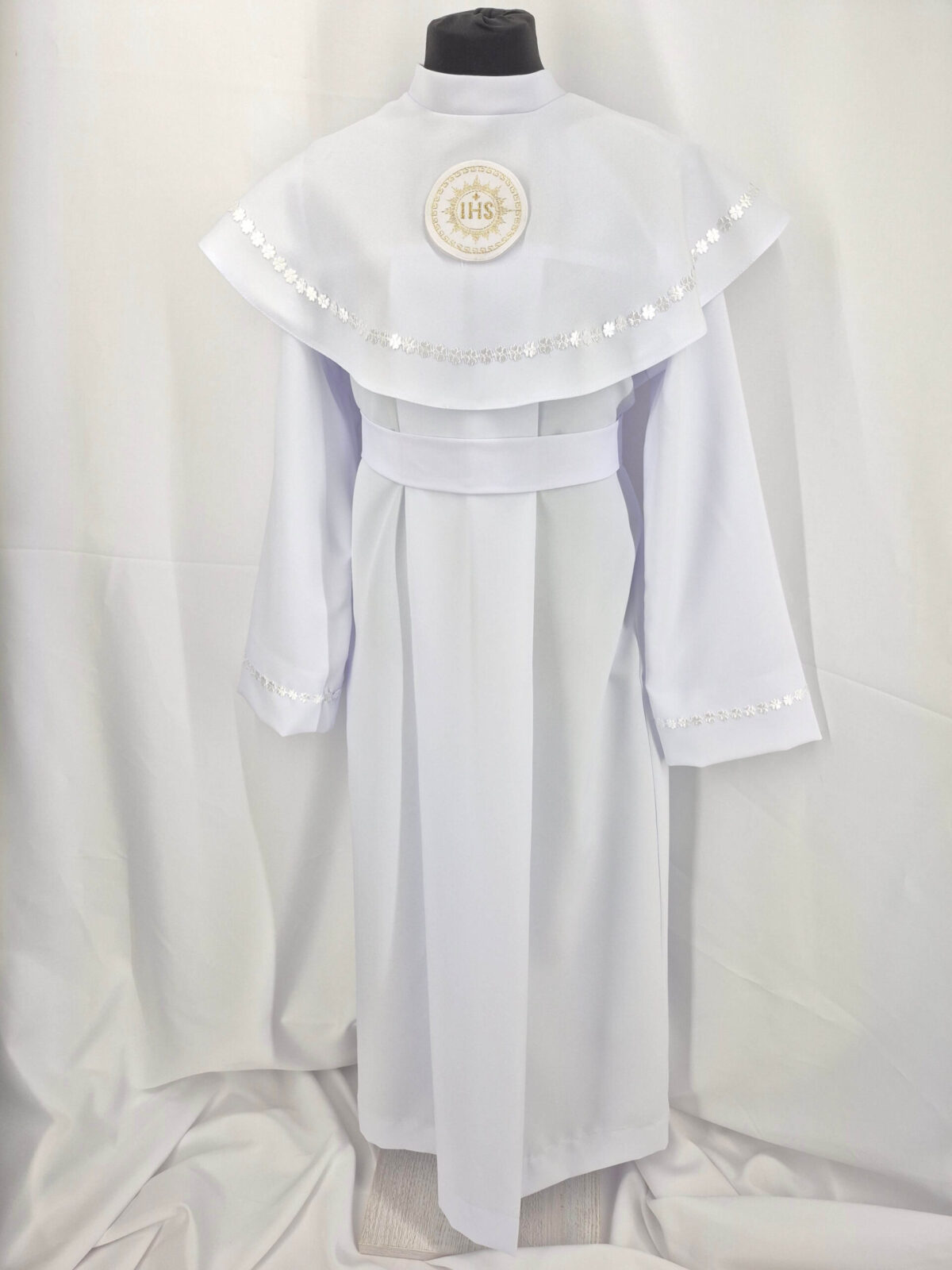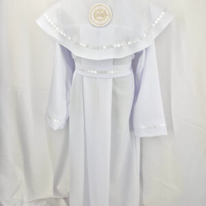 Alba tradycyjna to model ponadczasowy, który idealnie pasuje zarówno dla chłopców jak i dziewczynek. Jest to model uszyty z kontrfałdą z przodu i z tyłu alby oraz kołnierzem obszytym eleganckim zdobieniem i emblematem. To samo obszycie występuje na rękawach. Wykończenie alby stanowi biało-złoty sznurek lub pasek w zależności od Państwa wyboru.