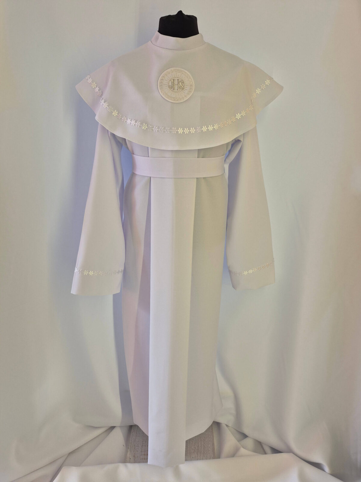 Alba uszyta jest z tkaniny stretch i zdobiona emblematem zgodnie z konkretnym modelem alby. Sznurek dobieramy kolorystycznie do obszycia i emblematu (jak na zdjęciu podglądowym). Za dodatkową opłatę doliczoną do zamówienia zamiast sznurka szyjemy pasek. Jeśli chcieliby Państwo wprowadzić jakieś zmiany do modelu prosimy o kontakt telefoniczny przed złożeniem zamówienia.Dostosujemy model według Państwa życzenia.