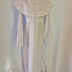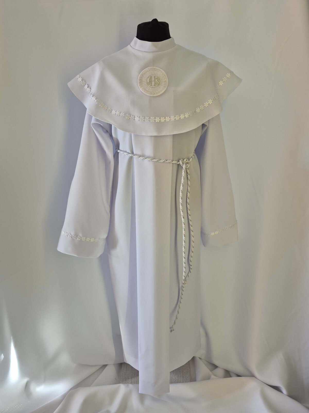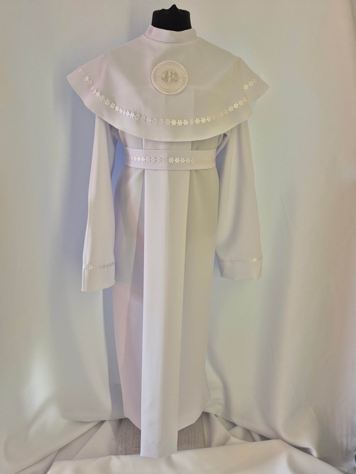 Alba tradycyjna to model ponadczasowy, który idealnie pasuje zarówno dla chłopców jak i dziewczynek. Jest to model uszyty z kontrfałdą z przodu i z tyłu alby oraz kołnierzem obszytym eleganckim zdobieniem i emblematem. To samo obszycie występuje na rękawach. Wykończenie alby stanowi biało-srebrny sznurek lub pasek w zależności od Państwa wyboru.