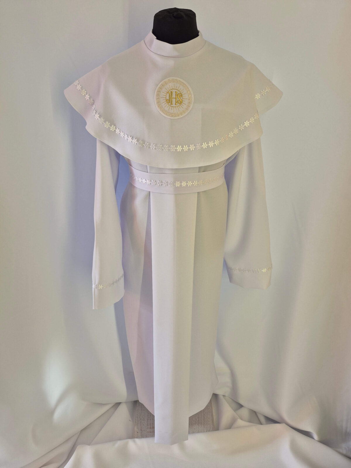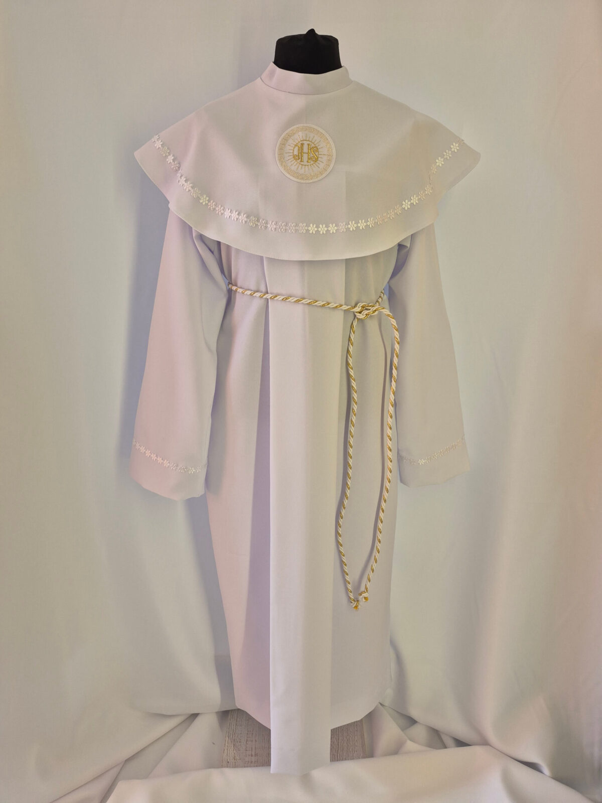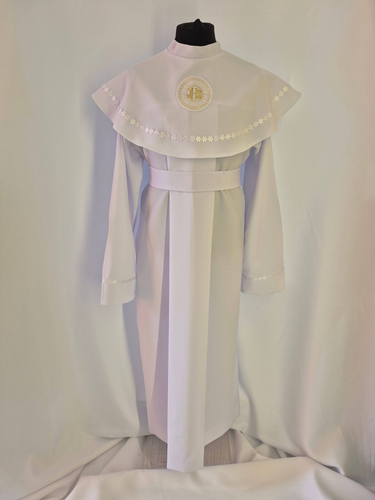 Alba uszyta jest z tkaniny stretch i zdobiona emblematem zgodnie z konkretnym modelem alby. Sznurek dobieramy kolorystycznie do obszycia i emblematu (jak na zdjęciu podglądowym). Za dodatkową opłatę doliczoną do zamówienia zamiast sznurka szyjemy pasek. Jeśli chcieliby Państwo wprowadzić jakieś zmiany do modelu prosimy o kontakt telefoniczny przed złożeniem zamówienia.Dostosujemy model według Państwa życzenia.