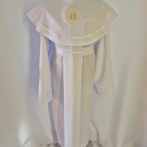 Alba tradycyjna to model ponadczasowy, który idealnie pasuje zarówno dla chłopców jak i dziewczynek. Jest to model uszyty z kontrfałdą z przodu i z tyłu alby oraz kołnierzem obszytym eleganckim zdobieniem i emblematem. To samo obszycie występuje na rękawach. Wykończenie alby stanowi biało-złoty sznurek lub pasek w zależności od Państwa wyboru.