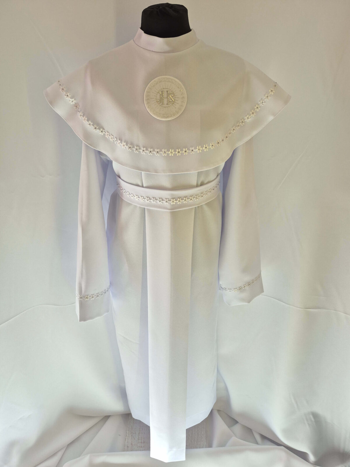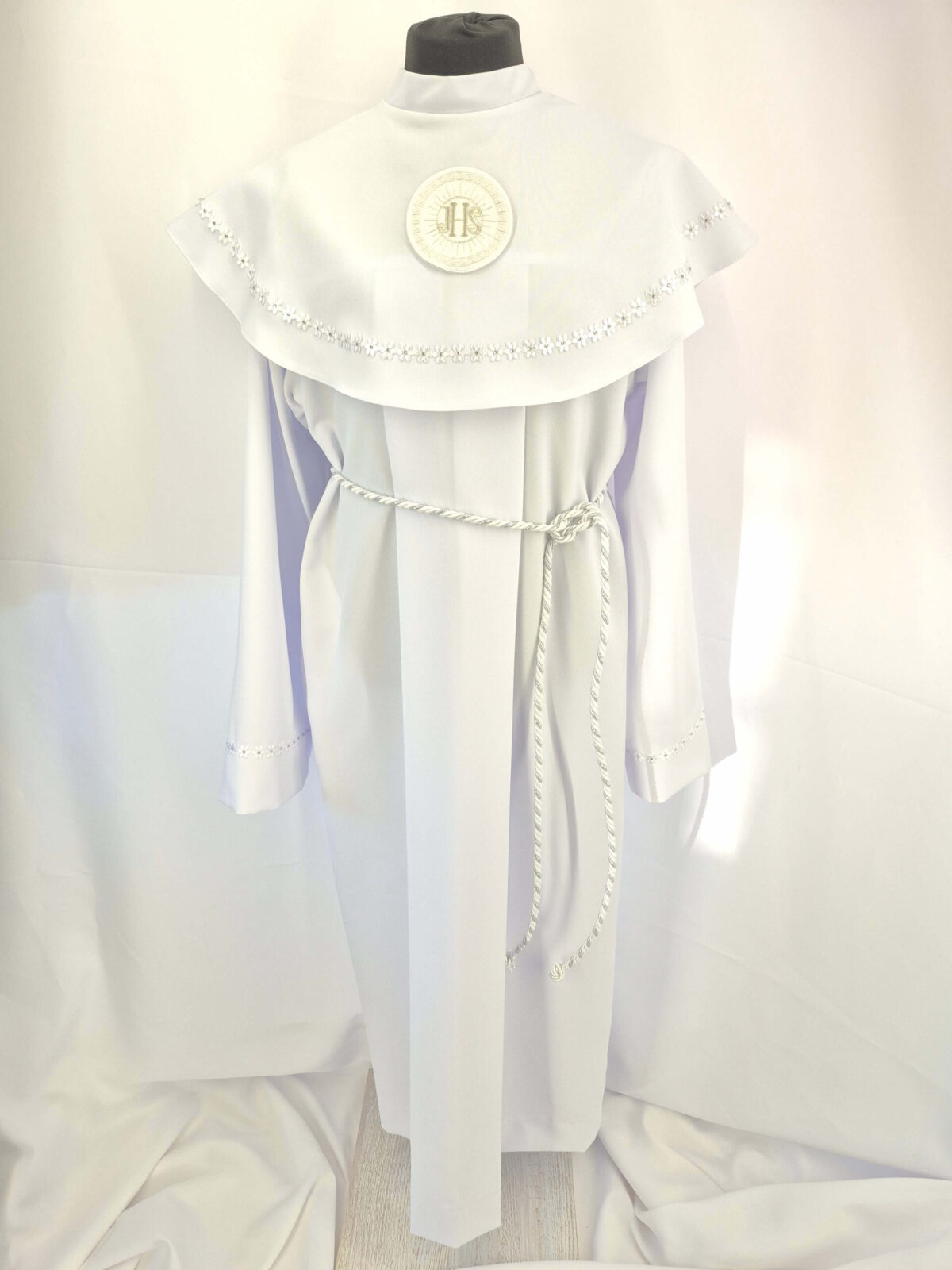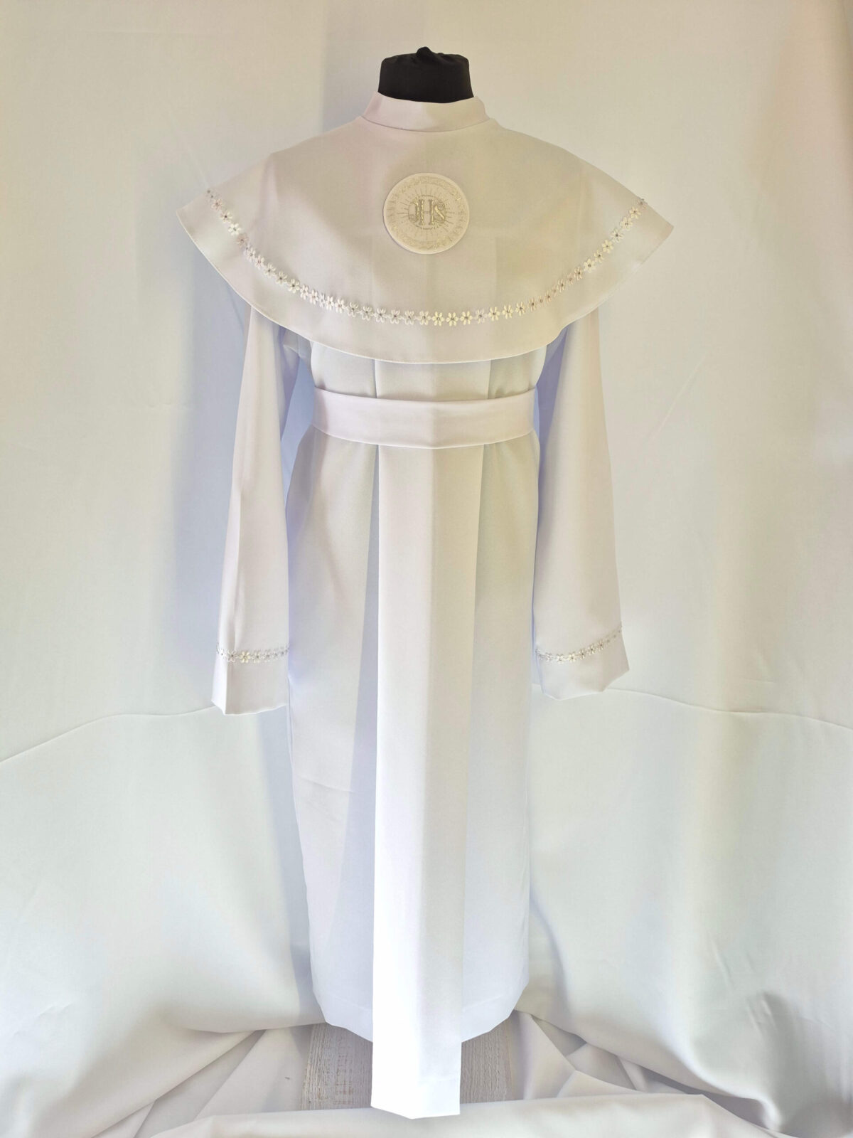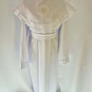 Alba tradycyjna to model ponadczasowy, który idealnie pasuje zarówno dla chłopców jak i dziewczynek. Jest to model uszyty z kontrfałdą z przodu i z tyłu alby oraz kołnierzem obszytym eleganckim zdobieniem i emblematem. To samo obszycie występuje na rękawach. Wykończenie alby stanowi biało-srebrny sznurek lub pasek w zależności od Państwa wyboru.