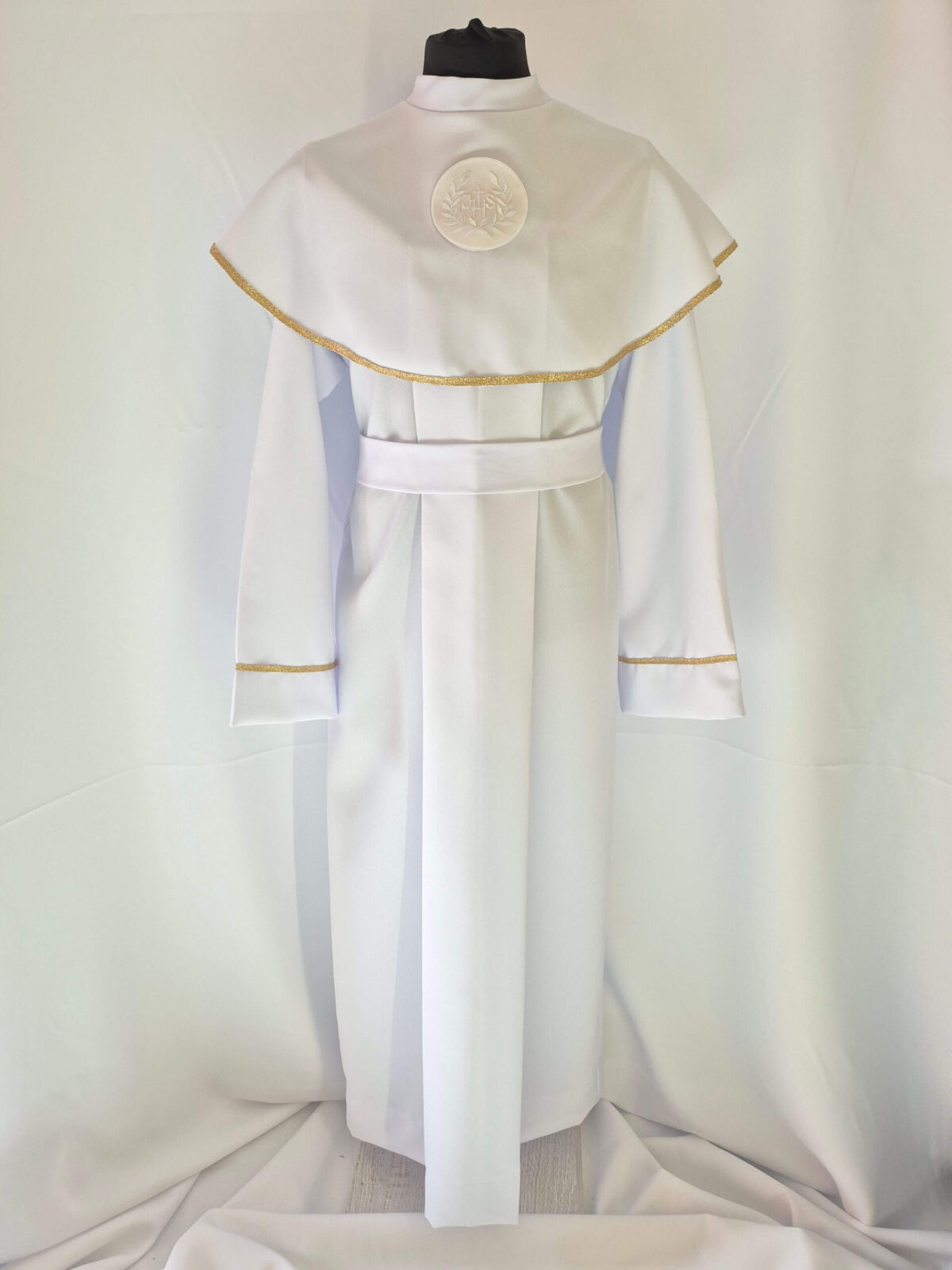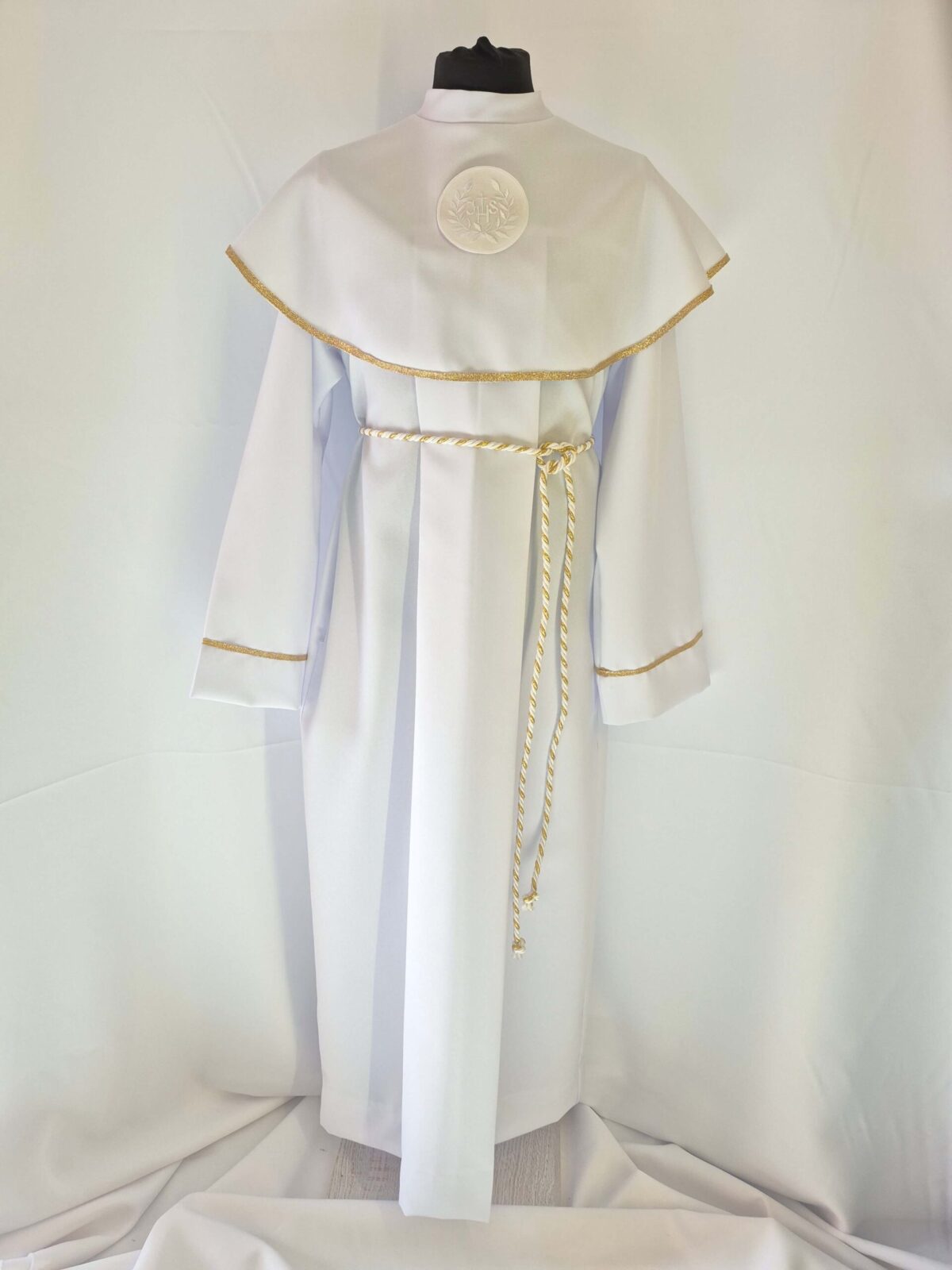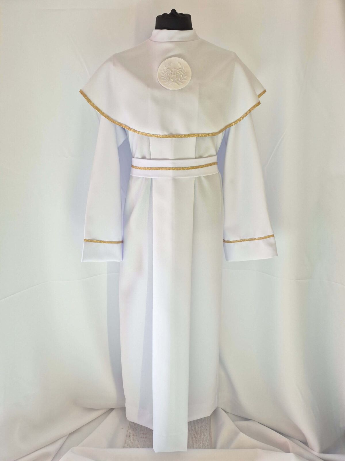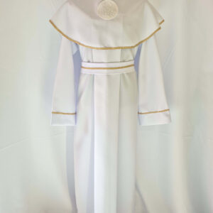 Alba tradycyjna to model ponadczasowy, który idealnie pasuje zarówno dla chłopców jak i dziewczynek. Jest to model uszyty z kontrfałdą z przodu i z tyłu alby oraz kołnierzem obszytym eleganckim zdobieniem i emblematem. To samo obszycie występuje na rękawach. Wykończenie alby stanowi biało-złoty sznurek lub pasek w zależności od Państwa wyboru.