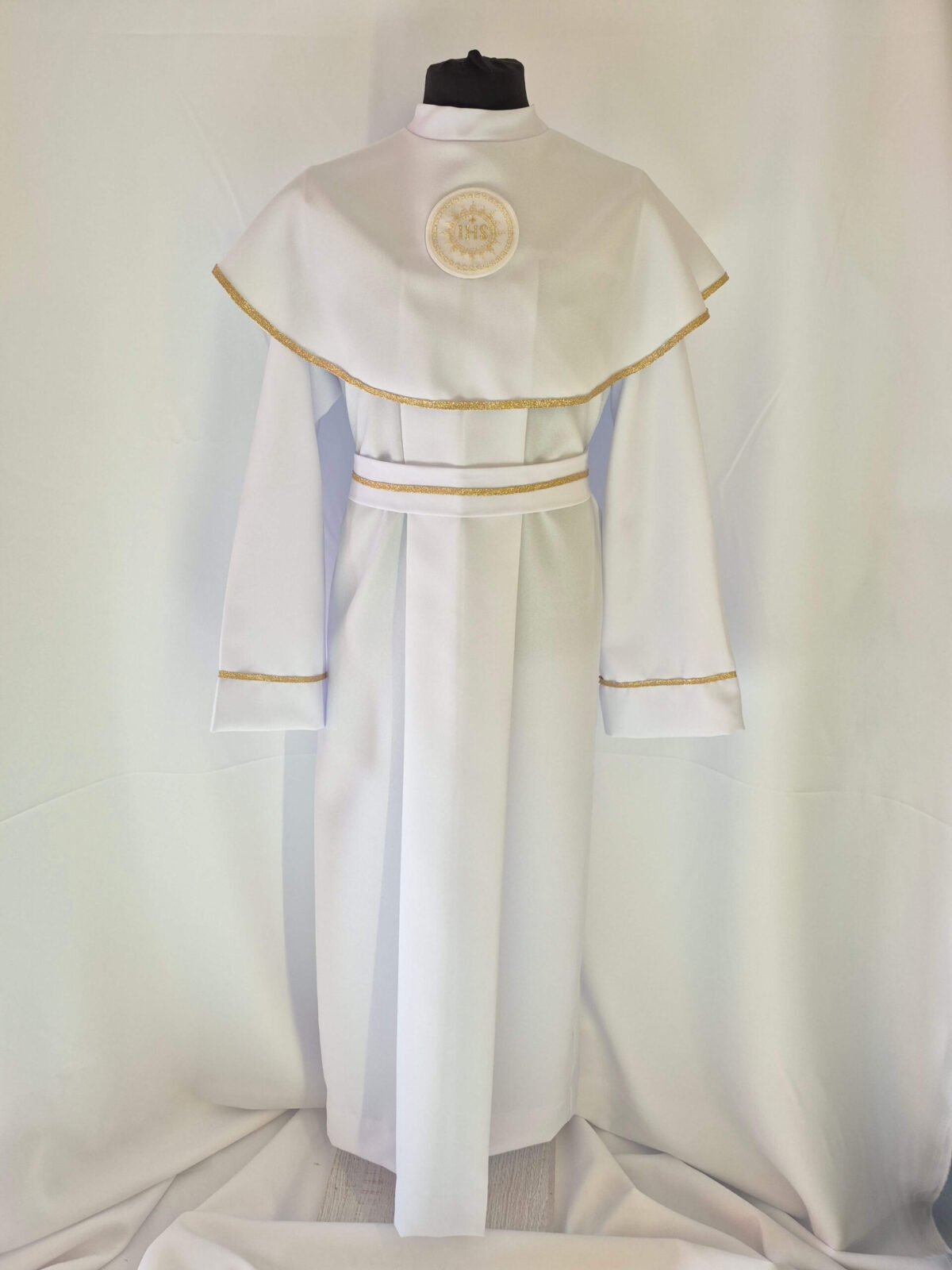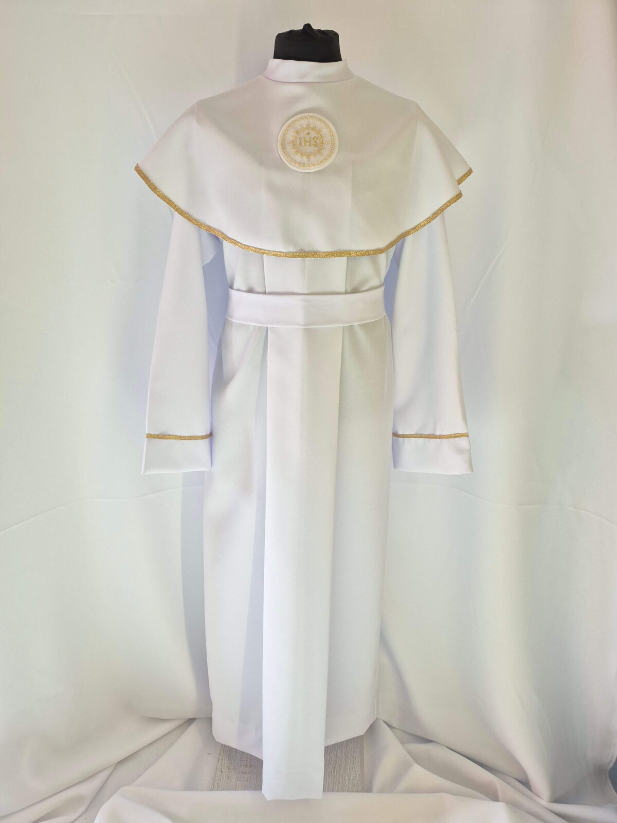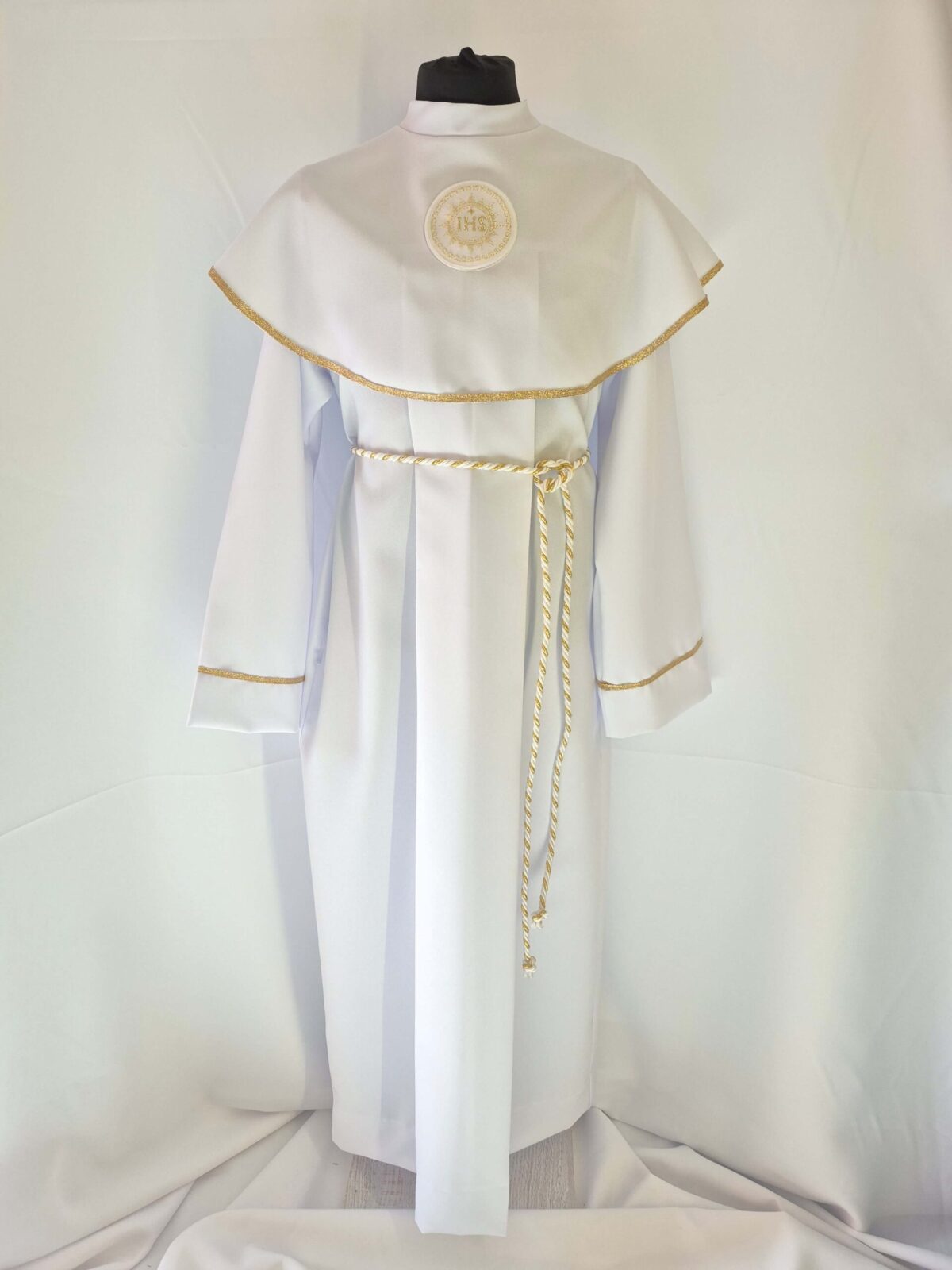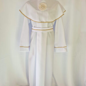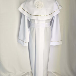 Alba tradycyjna to model ponadczasowy, który idealnie pasuje zarówno dla chłopców jak i dziewczynek. Jest to model uszyty z kontrfałdą z przodu i z tyłu alby oraz kołnierzem obszytym eleganckim zdobieniem i emblematem. To samo obszycie występuje na rękawach. Wykończenie alby stanowi biało-złoty sznurek lub pasek w zależności od Państwa wyboru.
