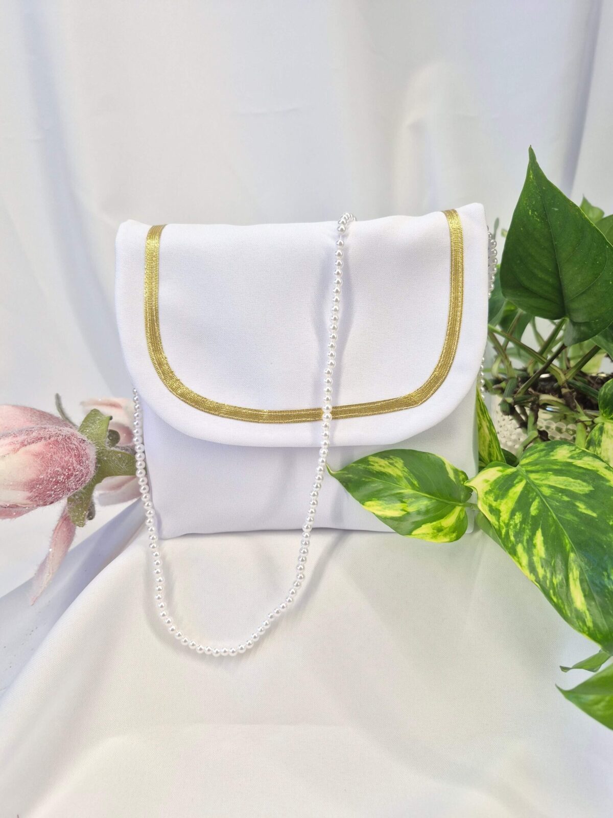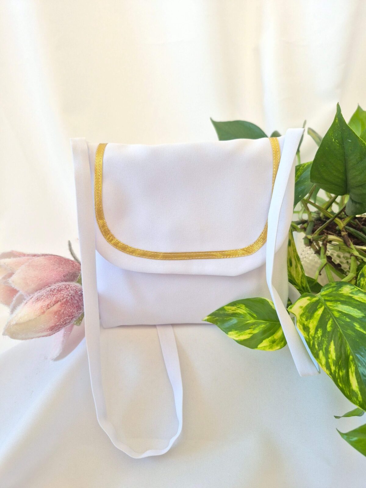Torebka uszyta jest z tej samej tkaniny, co alba (tkanina stretch). Torebka pomieści książeczkę, chusteczki i różaniec oraz inne akcesoria.