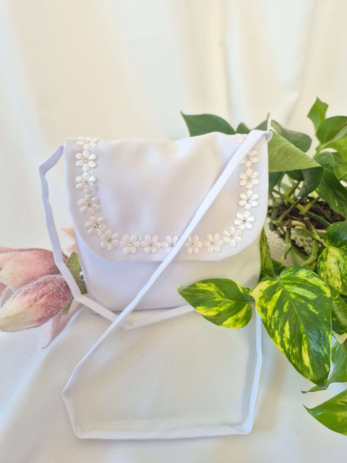 Torebka uszyta jest z tej samej tkaniny, co alba (tkanina stretch). Torebka pomieści książeczkę, chusteczki i różaniec oraz inne akcesoria.