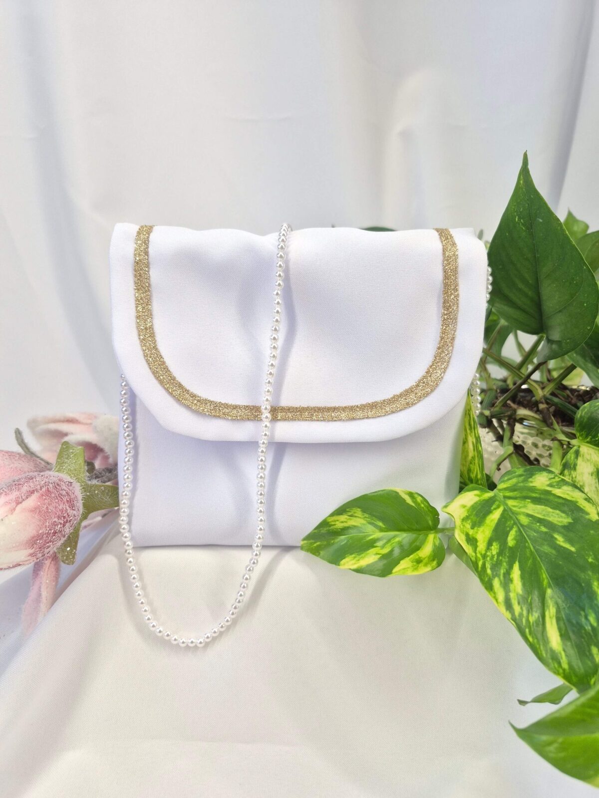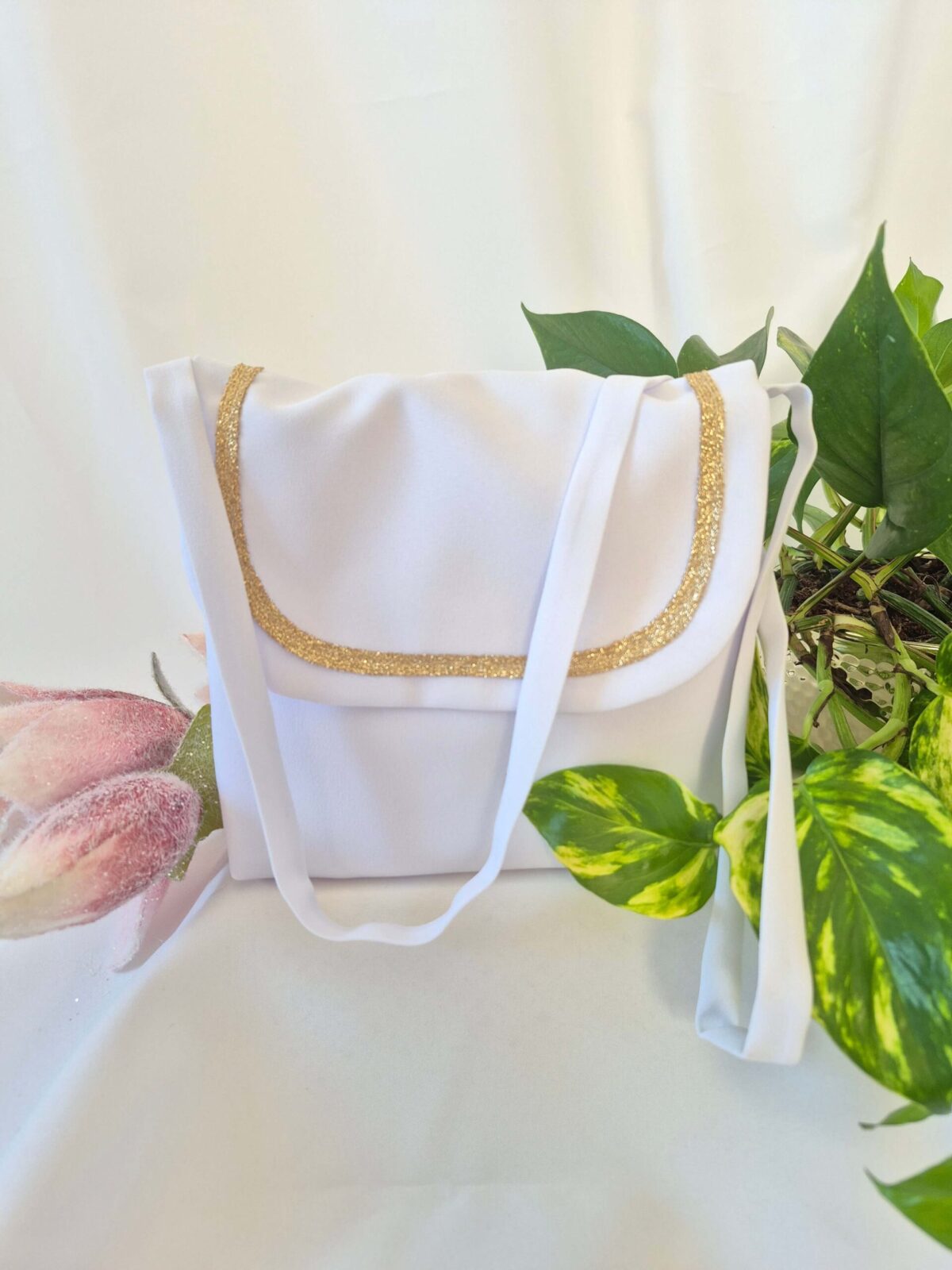 Torebka uszyta jest z tej samej tkaniny, co alba (tkanina stretch). Torebka pomieści książeczkę, chusteczki i różaniec oraz inne akcesoria.