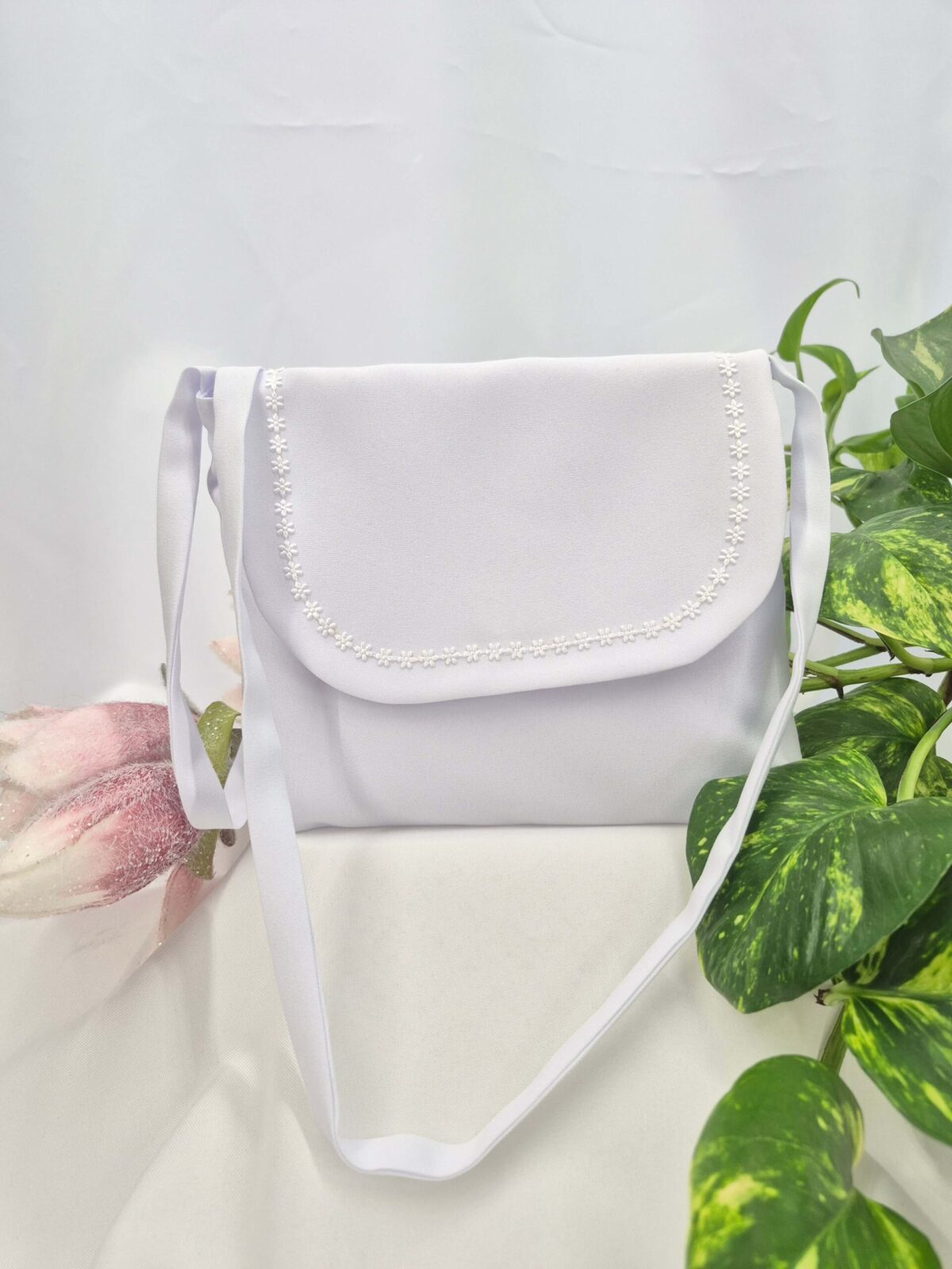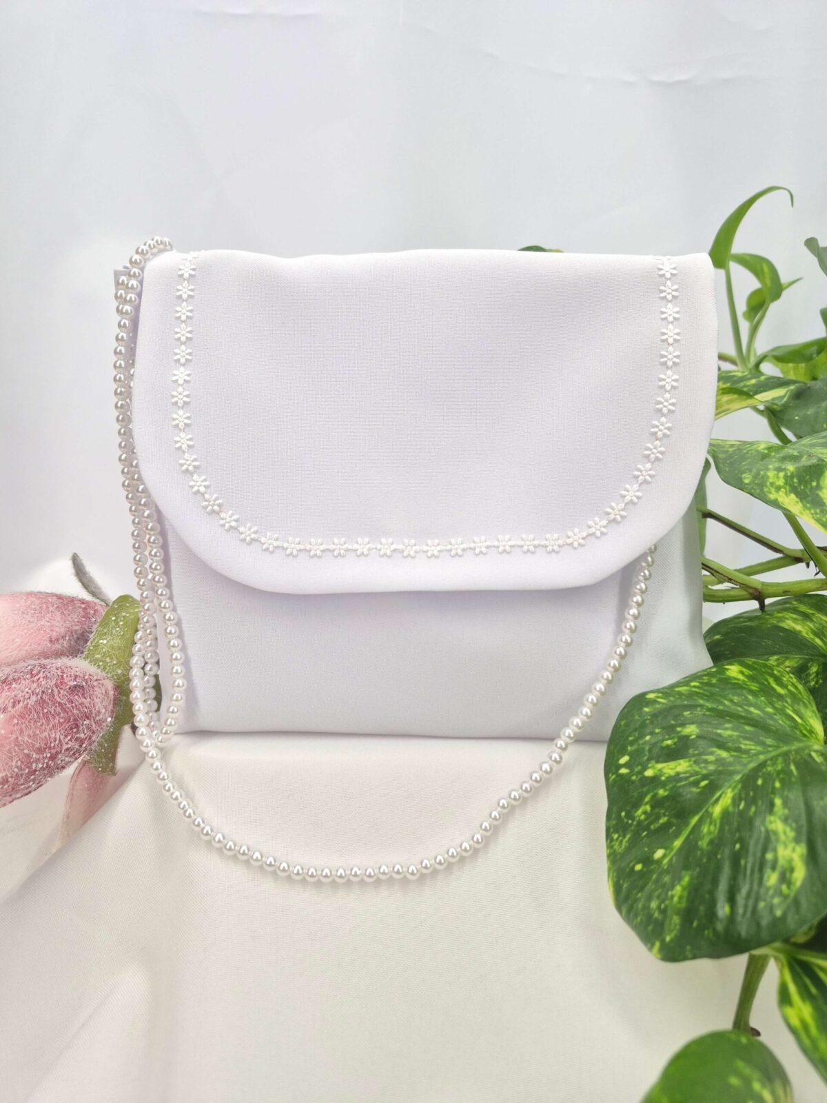 Torebka uszyta jest z tej samej tkaniny, co alba (tkanina stretch). Torebka pomieści książeczkę, chusteczki i różaniec oraz inne akcesoria.