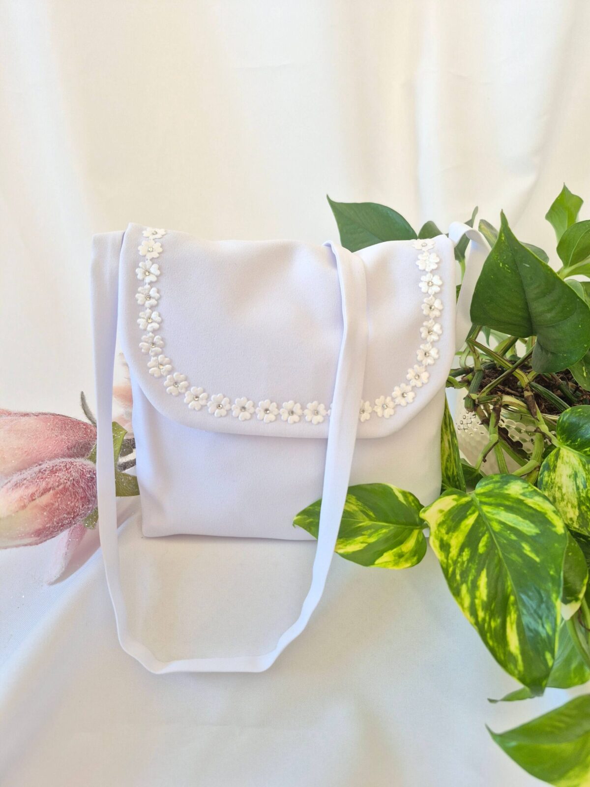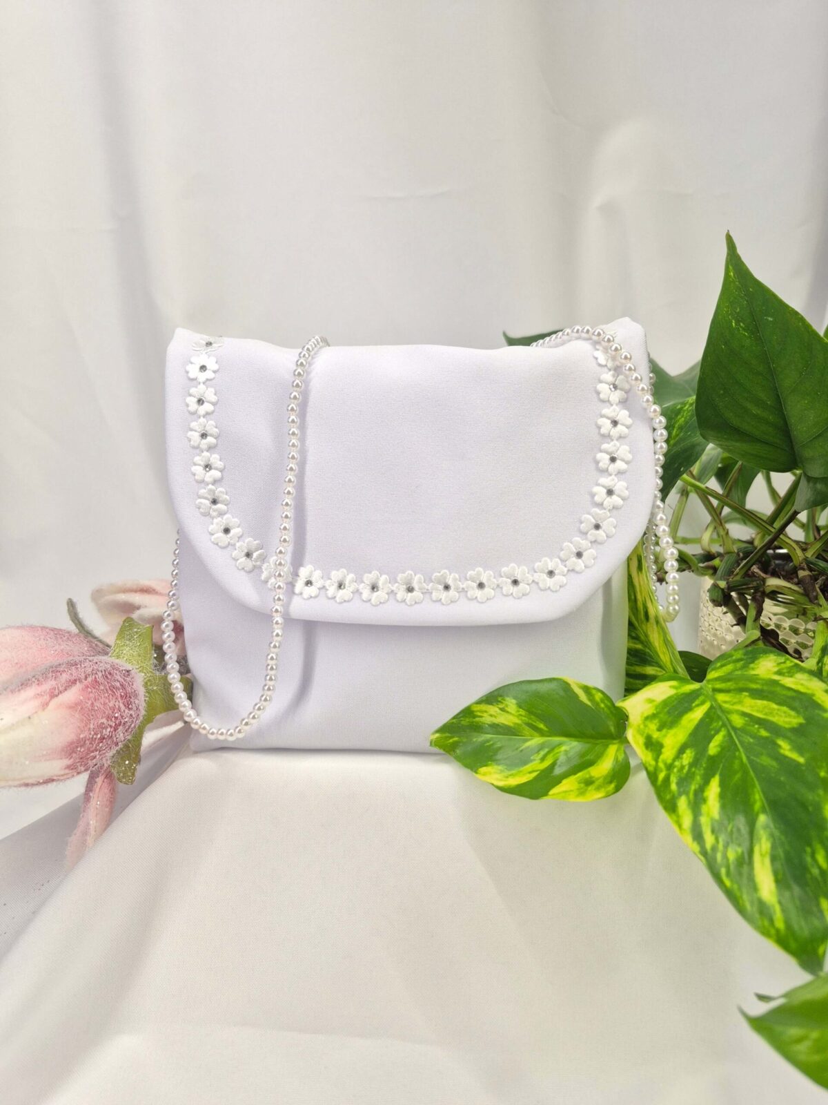 Torebka uszyta jest z tej samej tkaniny, co alba (tkanina stretch). Torebka pomieści książeczkę, chusteczki i różaniec oraz inne akcesoria.