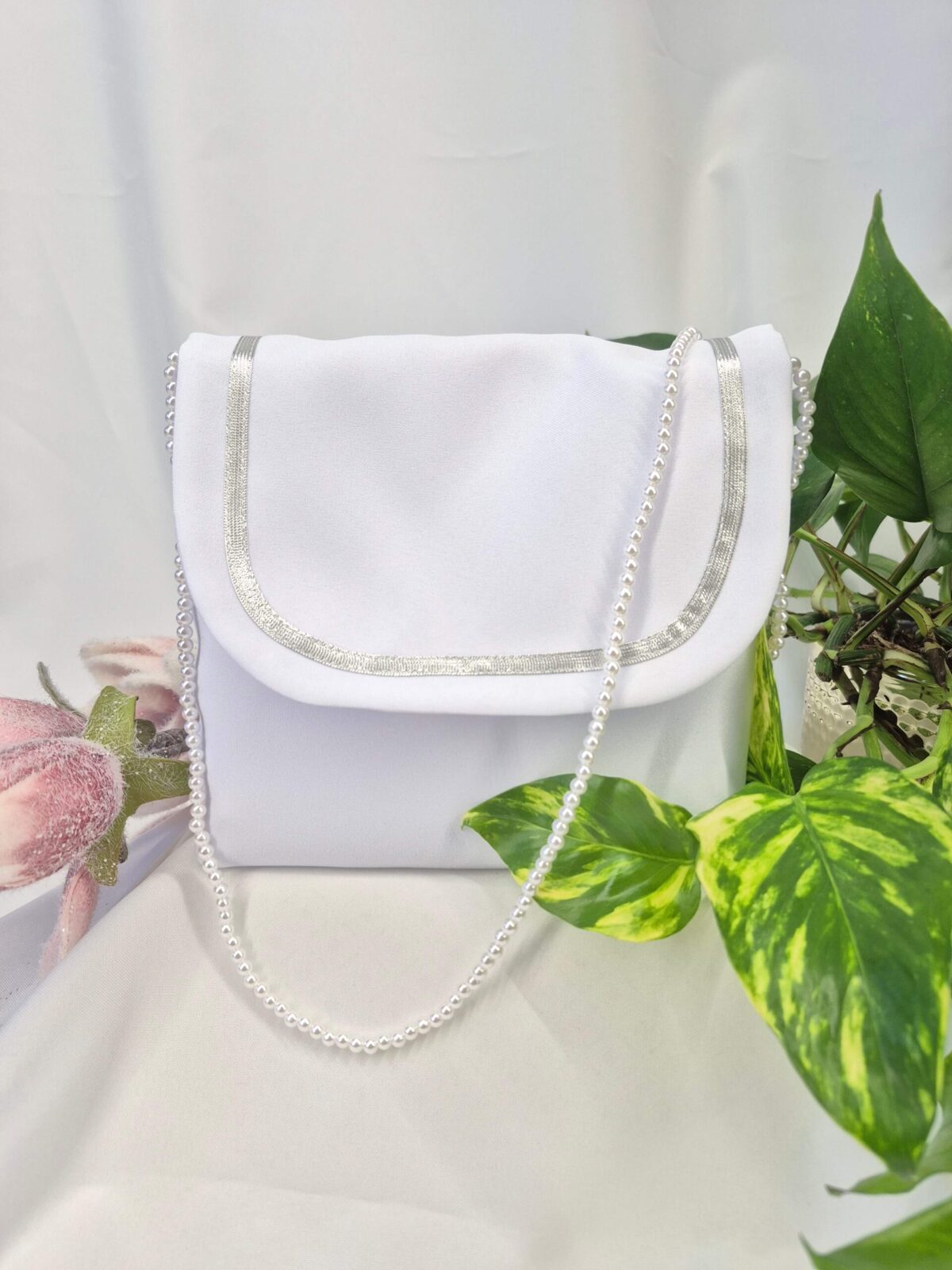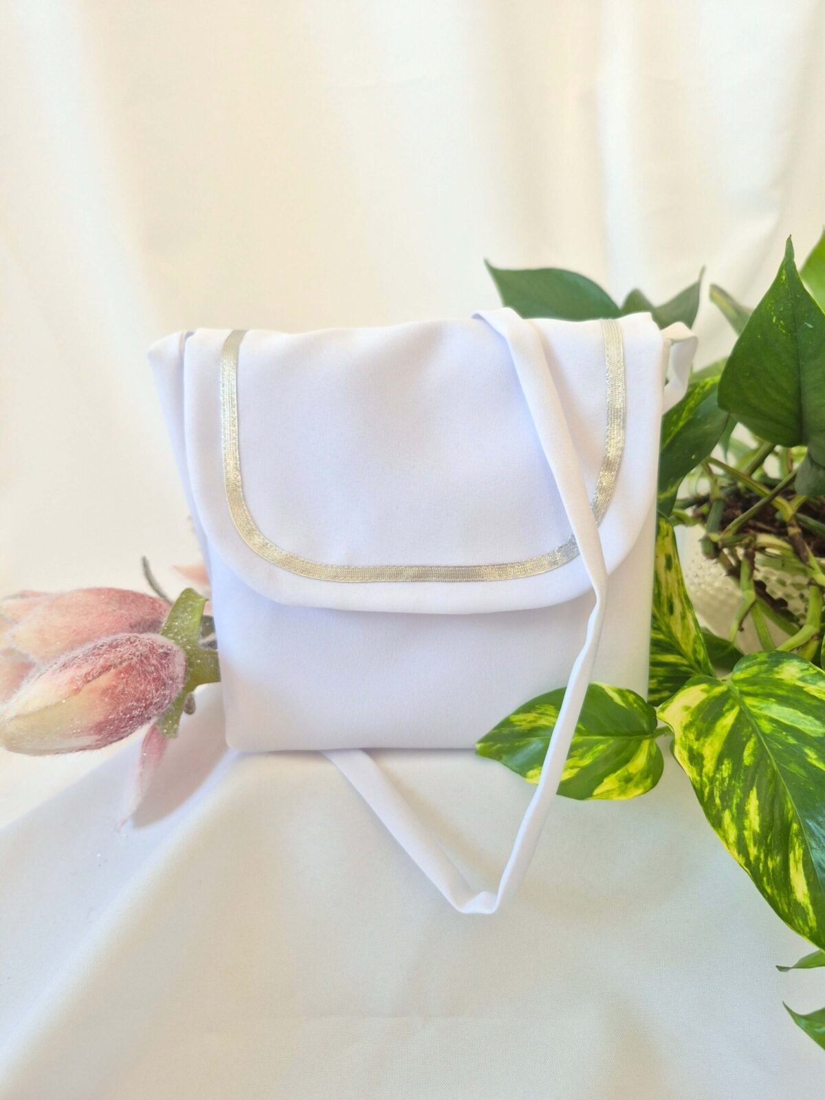 Torebka uszyta jest z tej samej tkaniny, co alba (tkanina stretch). Torebka pomieści książeczkę, chusteczki i różaniec oraz inne akcesoria.