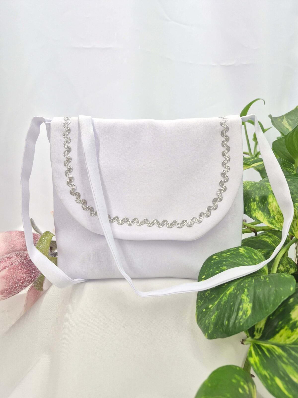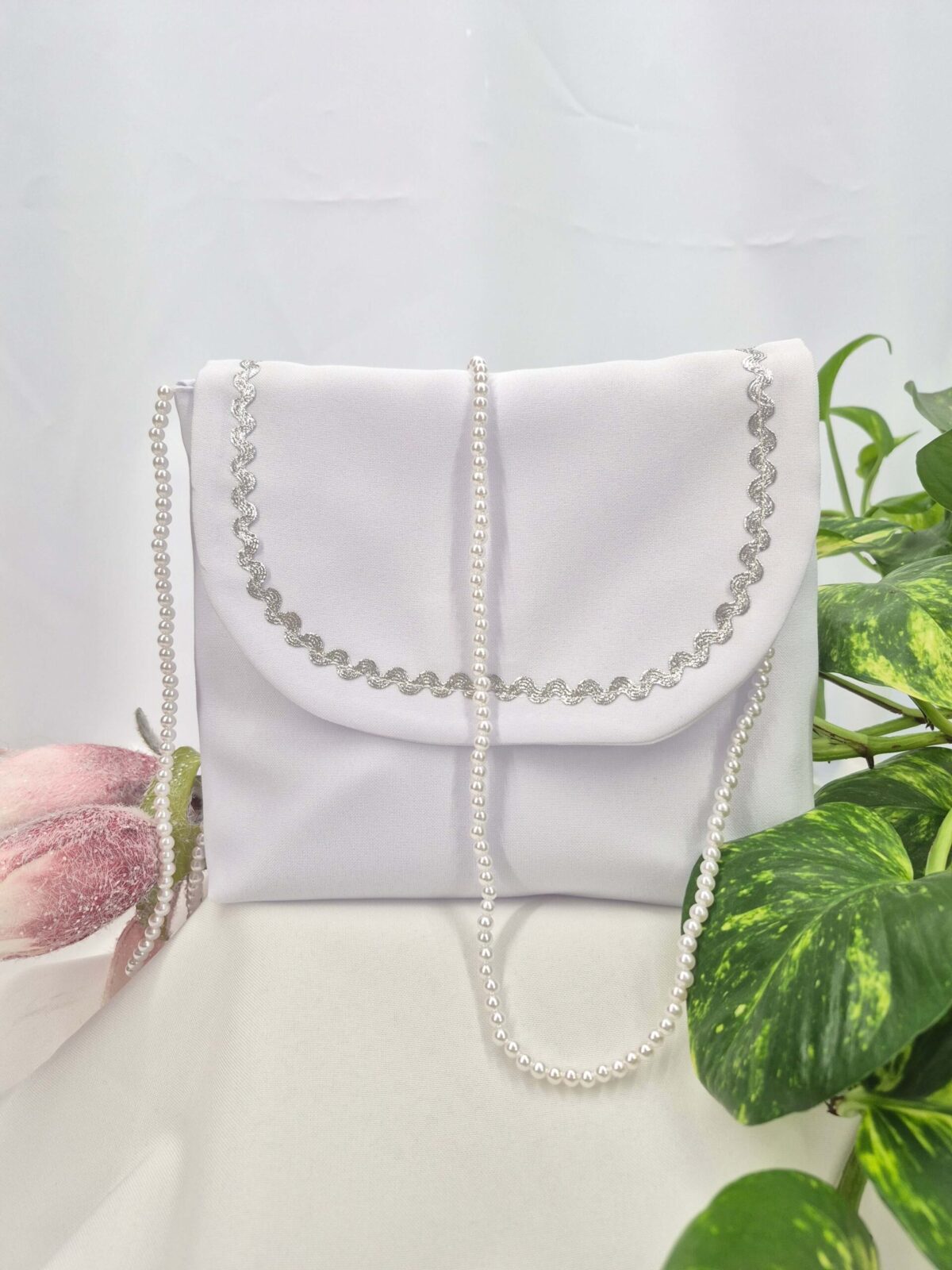 Torebka uszyta jest z tej samej tkaniny, co alba (tkanina stretch). Torebka pomieści książeczkę, chusteczki i różaniec oraz inne akcesoria.