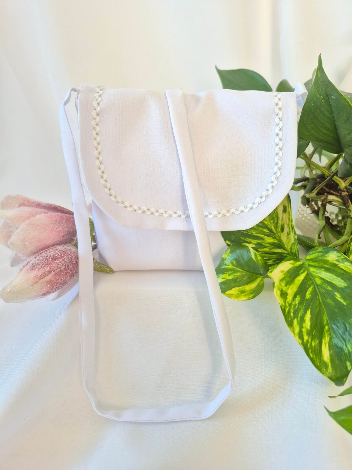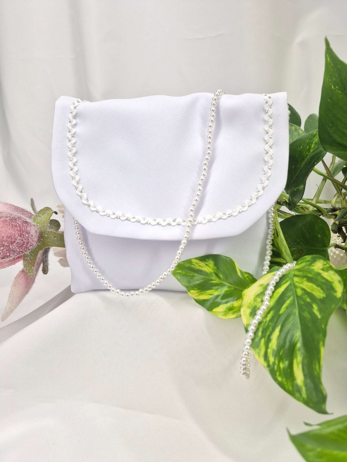 Torebka uszyta jest z tej samej tkaniny, co alba (tkanina stretch). Torebka pomieści książeczkę, chusteczki i różaniec oraz inne akcesoria.