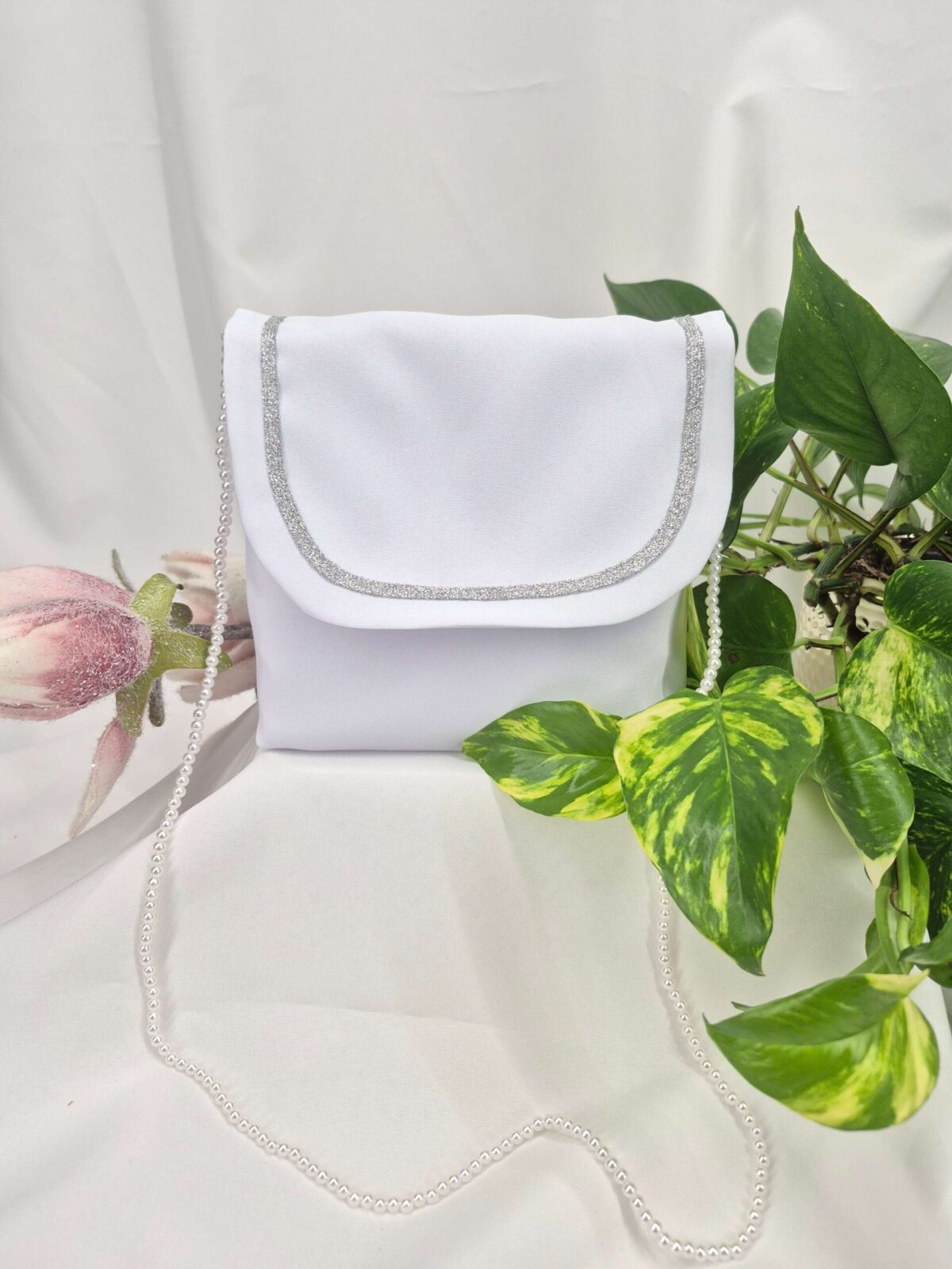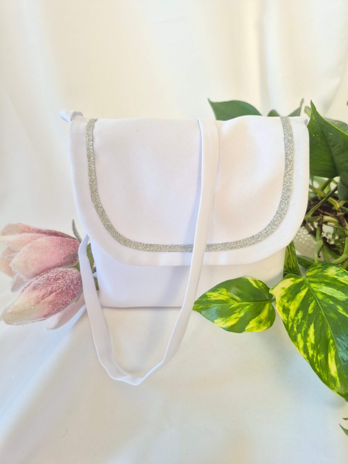 Torebka uszyta jest z tej samej tkaniny, co alba (tkanina stretch). Torebka pomieści książeczkę, chusteczki i różaniec oraz inne akcesoria.