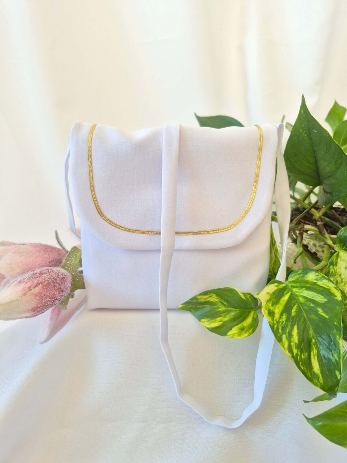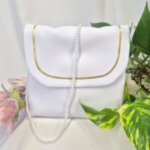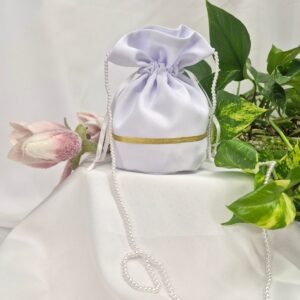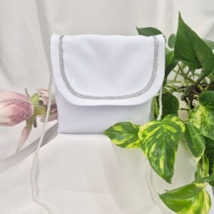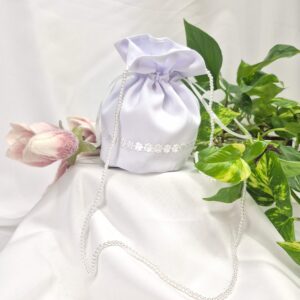Torebka uszyta jest z tej samej tkaniny, co alba (tkanina stretch). Torebka pomieści książeczkę, chusteczki i różaniec oraz inne akcesoria.