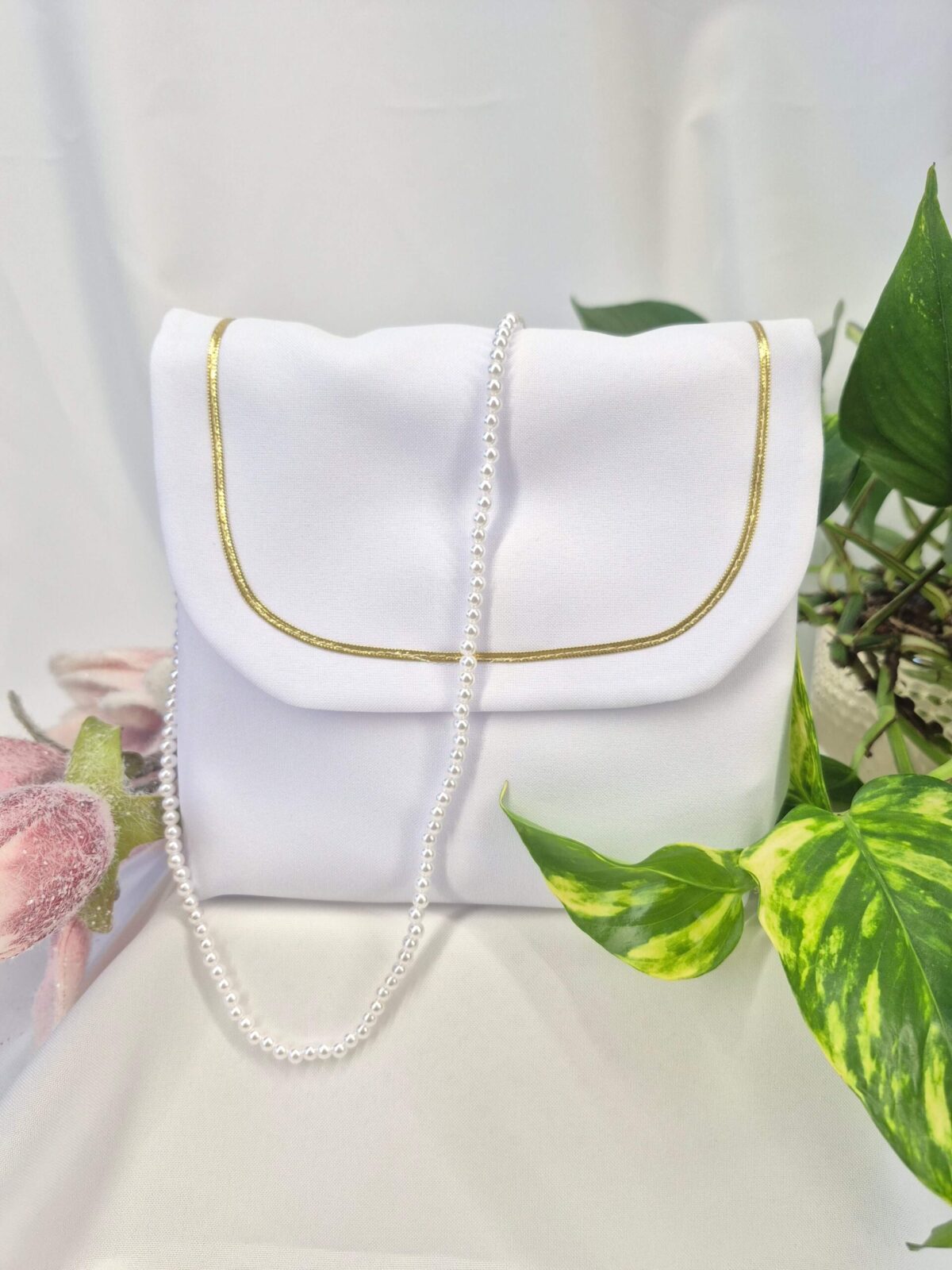 Torebka uszyta jest z tej samej tkaniny, co alba (tkanina stretch). Torebka pomieści książeczkę, chusteczki i różaniec oraz inne akcesoria.