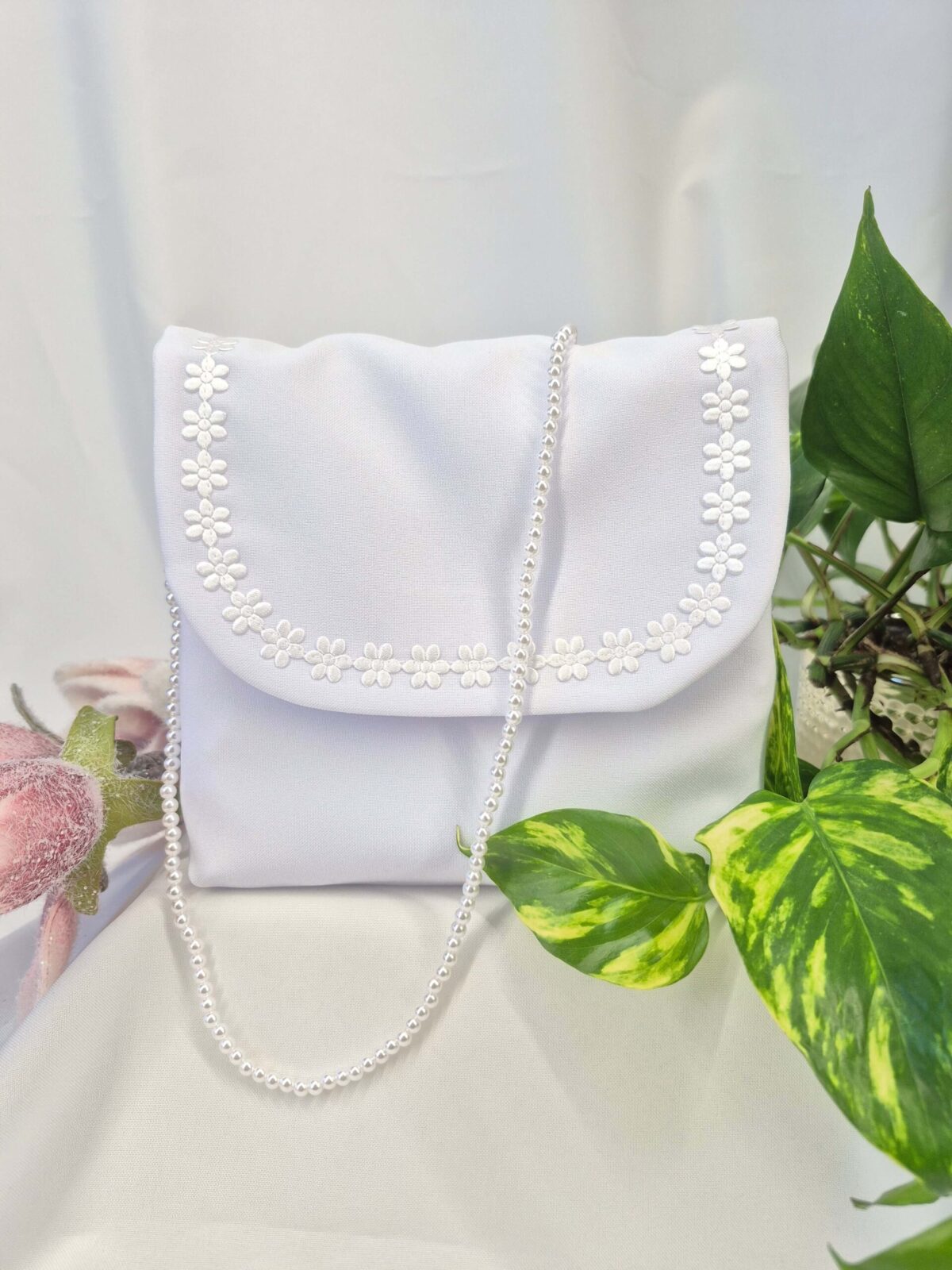 Torebka uszyta jest z tej samej tkaniny, co alba (tkanina stretch). Torebka pomieści książeczkę, chusteczki i różaniec oraz inne akcesoria.