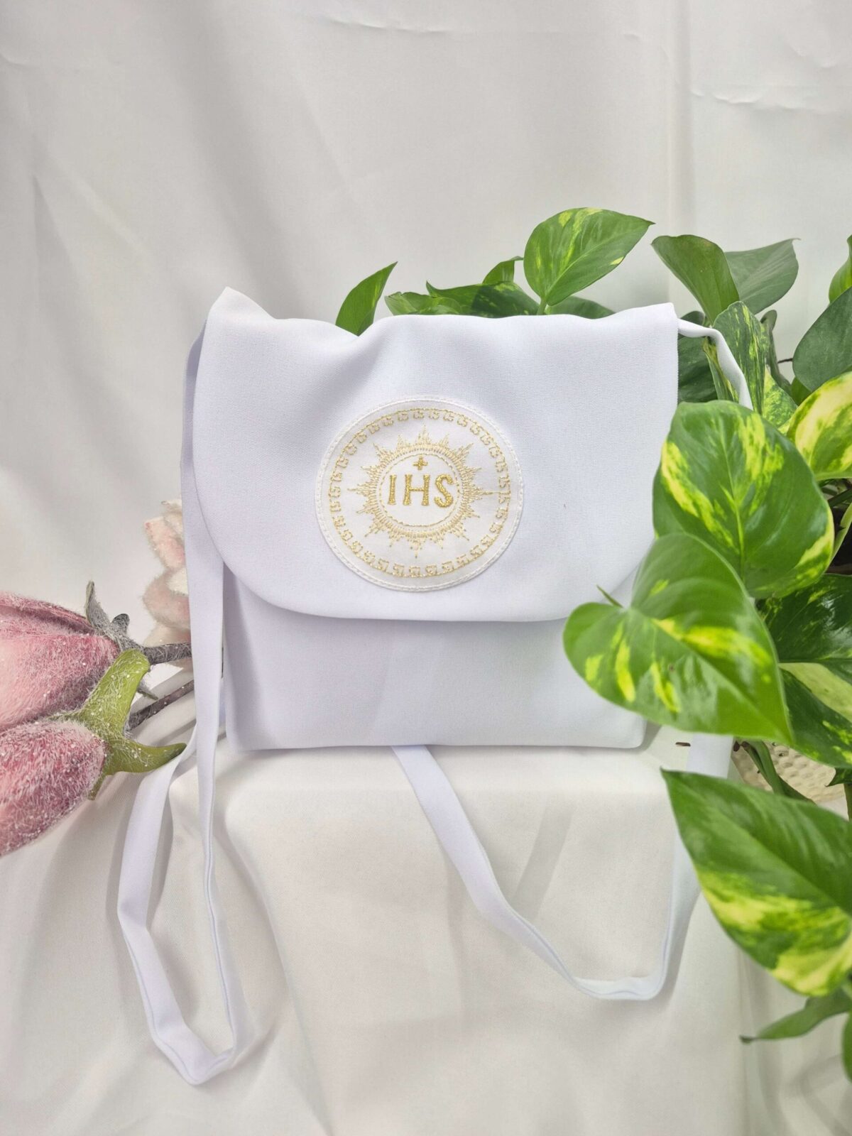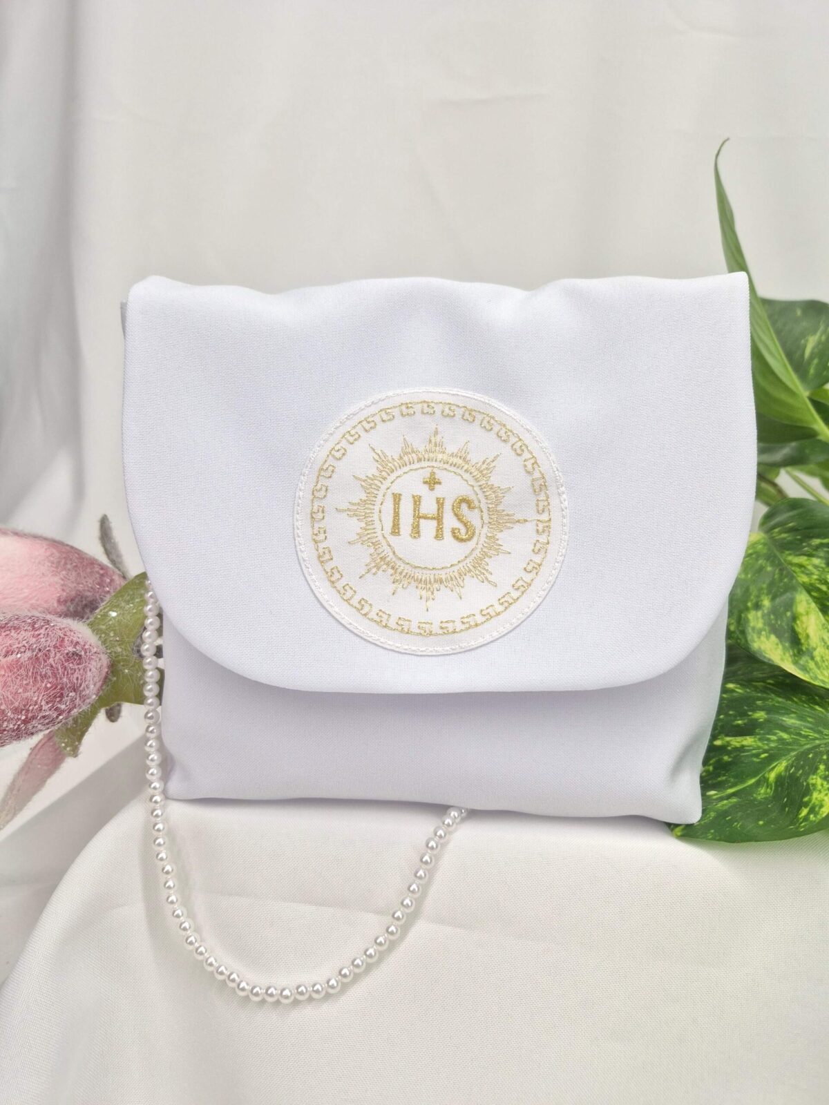 Torebka uszyta jest z tej samej tkaniny, co alba (tkanina stretch). Torebka pomieści książeczkę, chusteczki i różaniec oraz inne akcesoria.