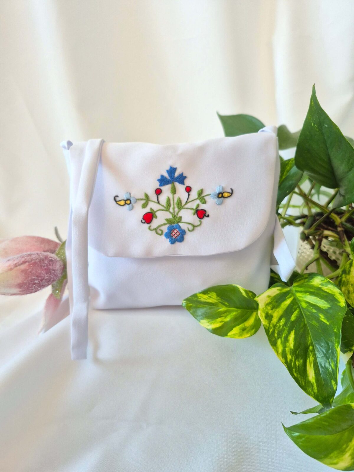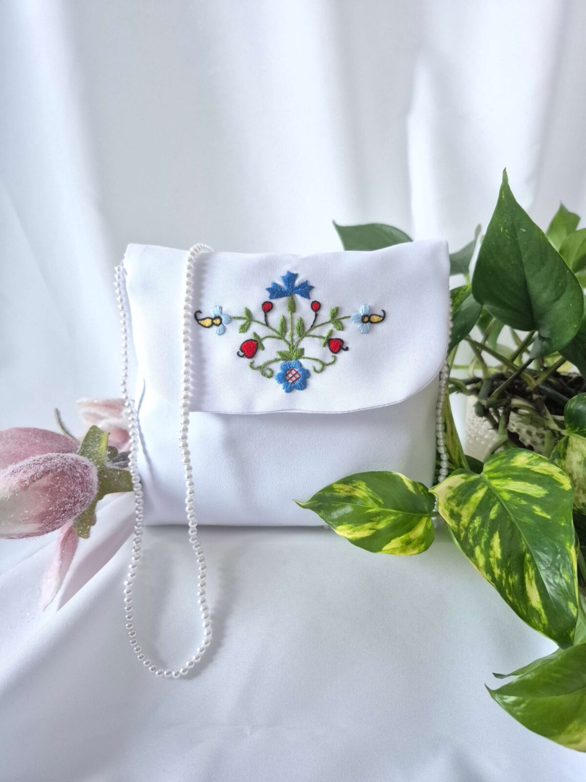 Torebka uszyta jest z tej samej tkaniny, co alba (tkanina stretch). Torebka pomieści książeczkę, chusteczki i różaniec oraz inne akcesoria.