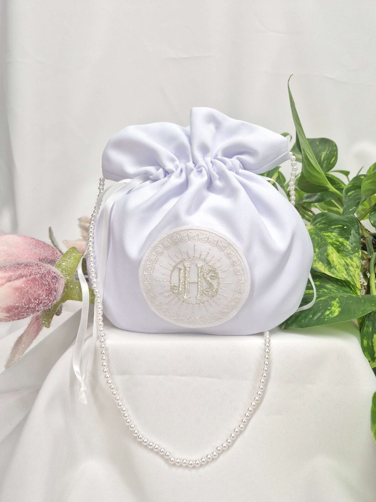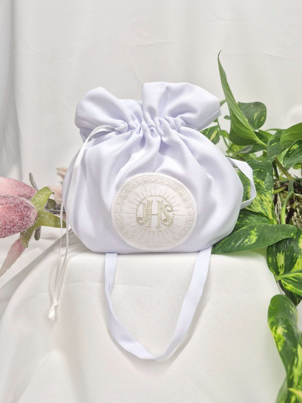 Saszetka uszyta jest z tej samej tkaniny, co alba (tkanina stretch). Saszetka pomieści książeczkę, chusteczki i różaniec oraz inne akcesoria.