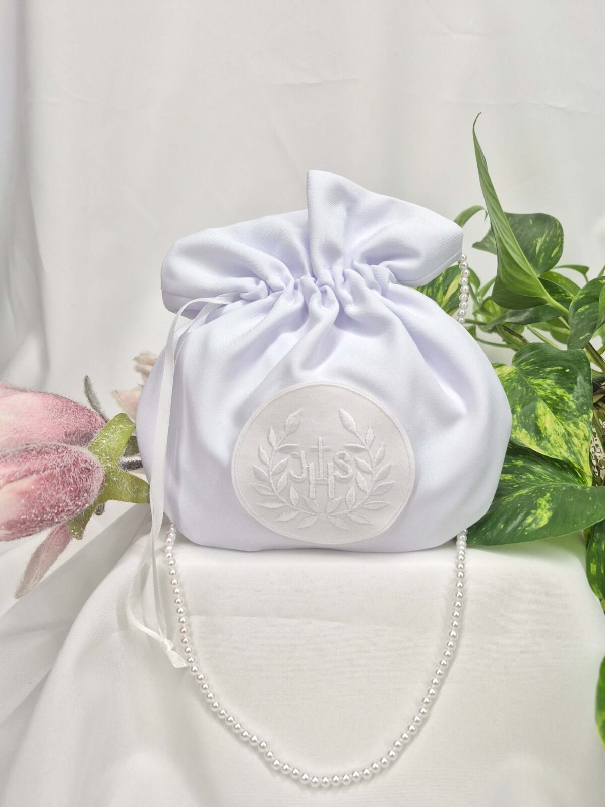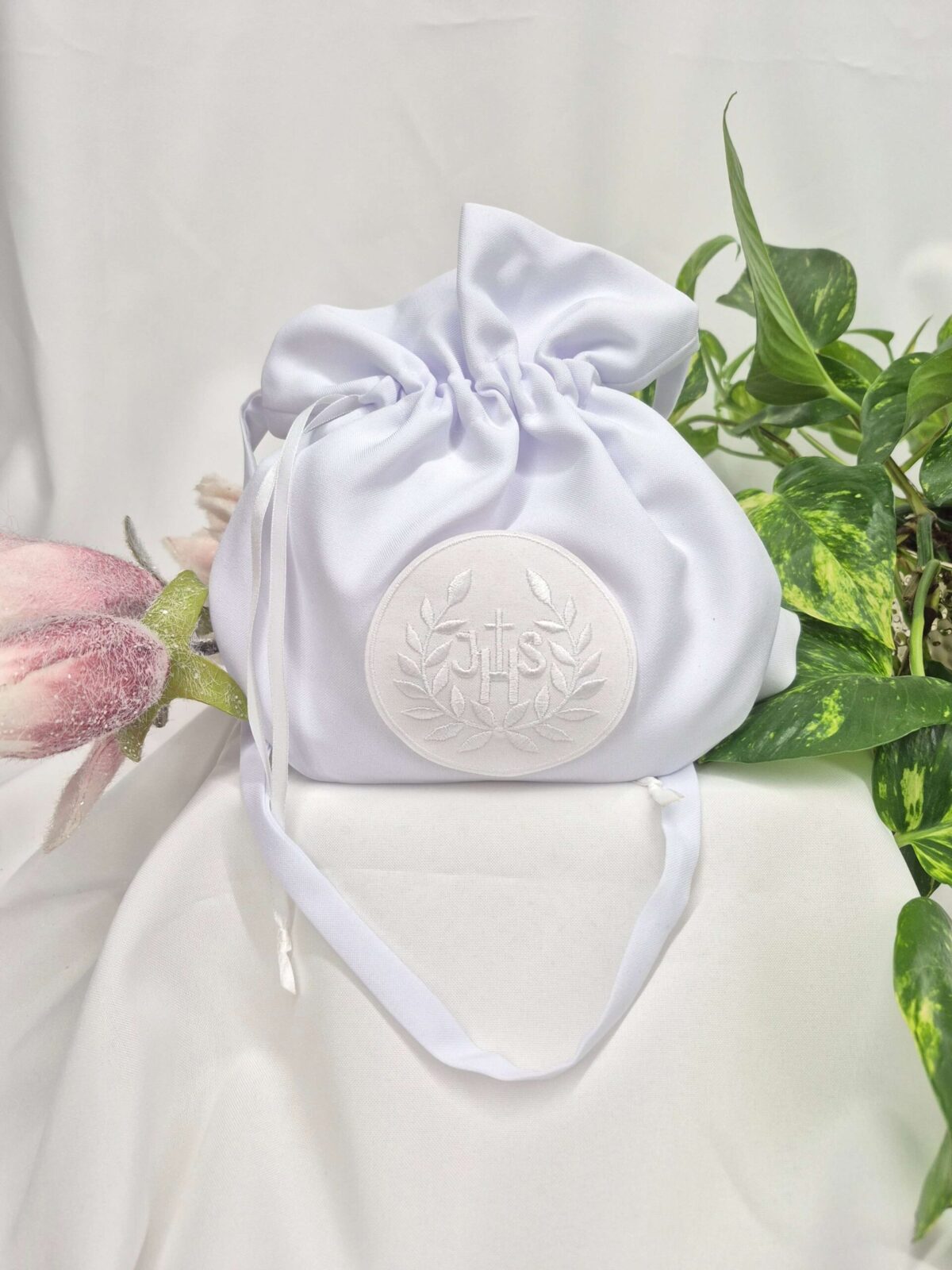 Saszetka uszyta jest z tej samej tkaniny, co alba (tkanina stretch). Saszetka pomieści książeczkę, chusteczki i różaniec oraz inne akcesoria.