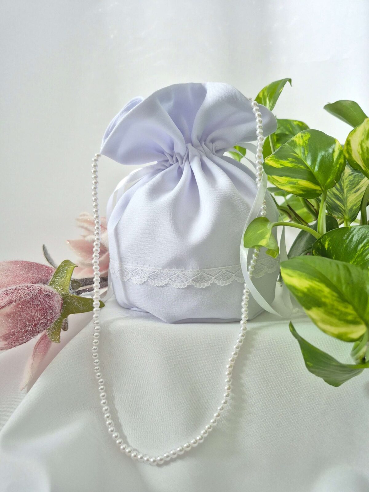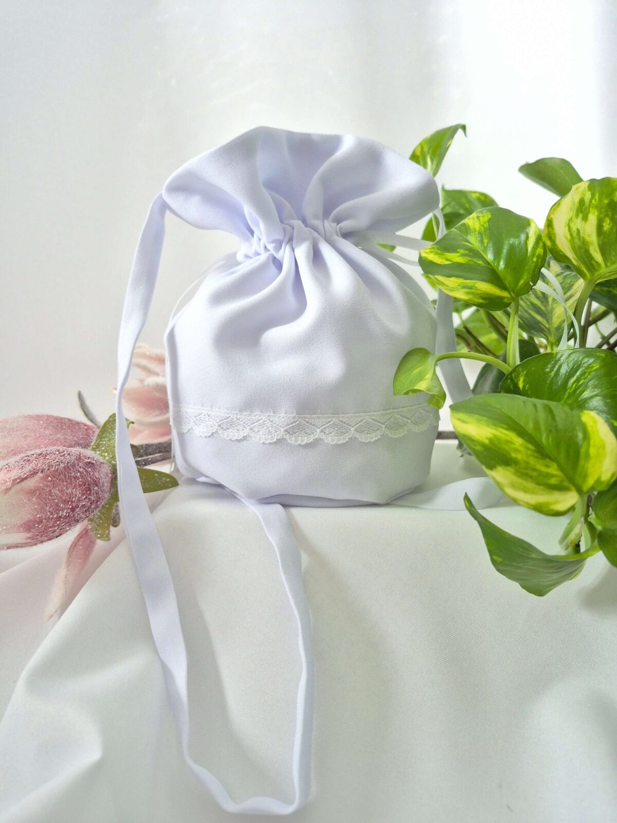 Worek uszyty jest z tej samej tkaniny, co alba (tkanina stretch). Worek pomieści książeczkę, chusteczki i różaniec oraz inne akcesoria.