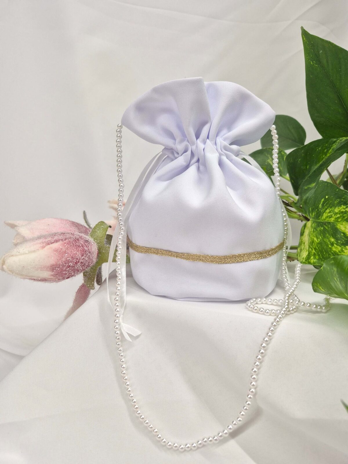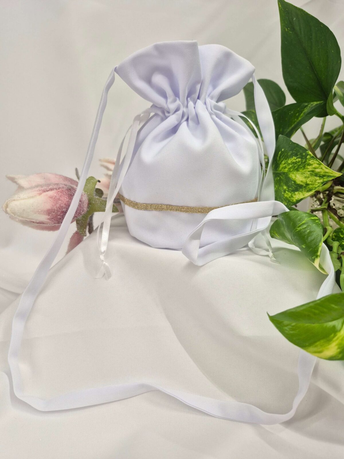 Worek uszyty jest z tej samej tkaniny, co alba (tkanina stretch). Worek pomieści książeczkę, chusteczki i różaniec oraz inne akcesoria.