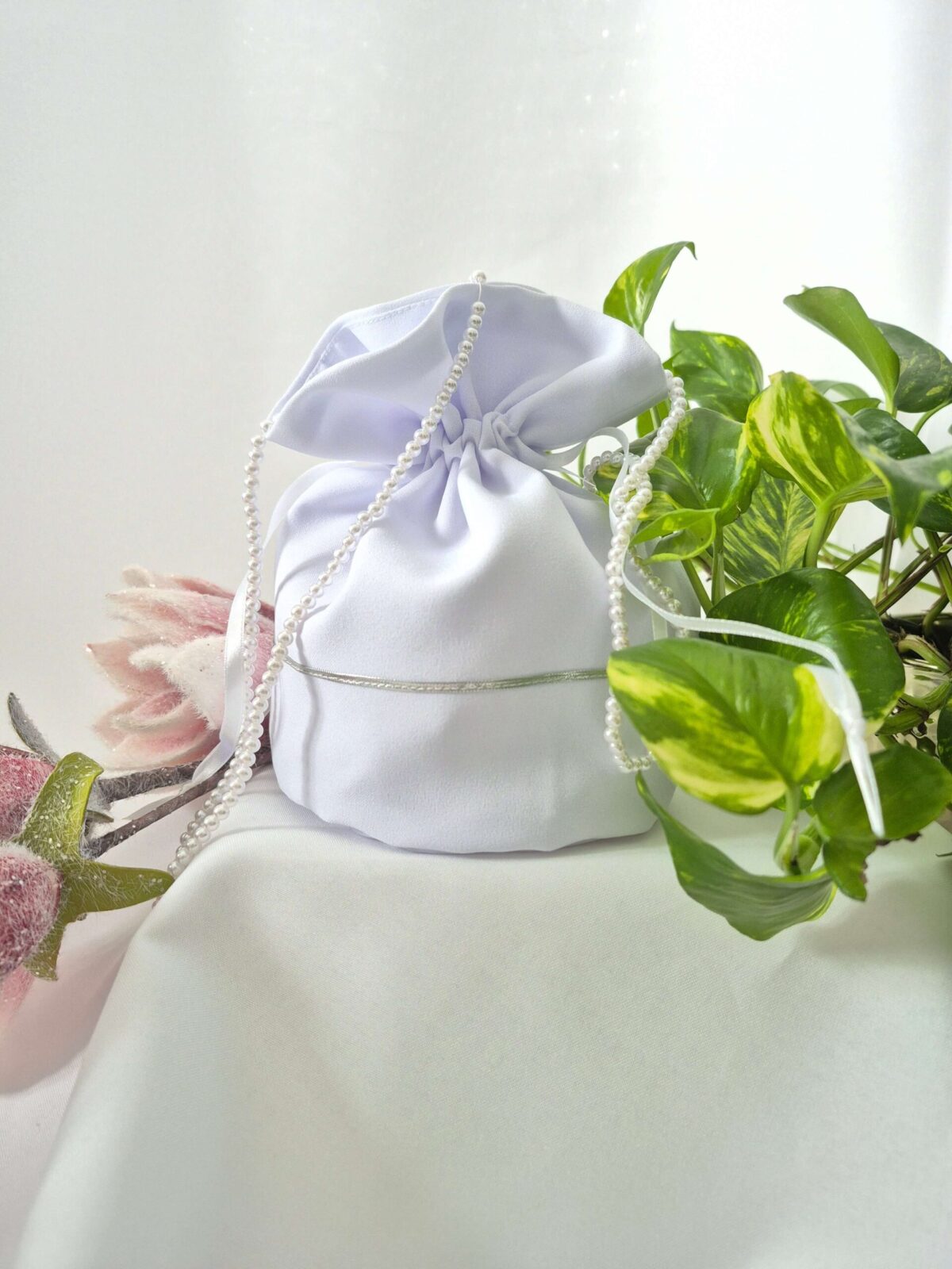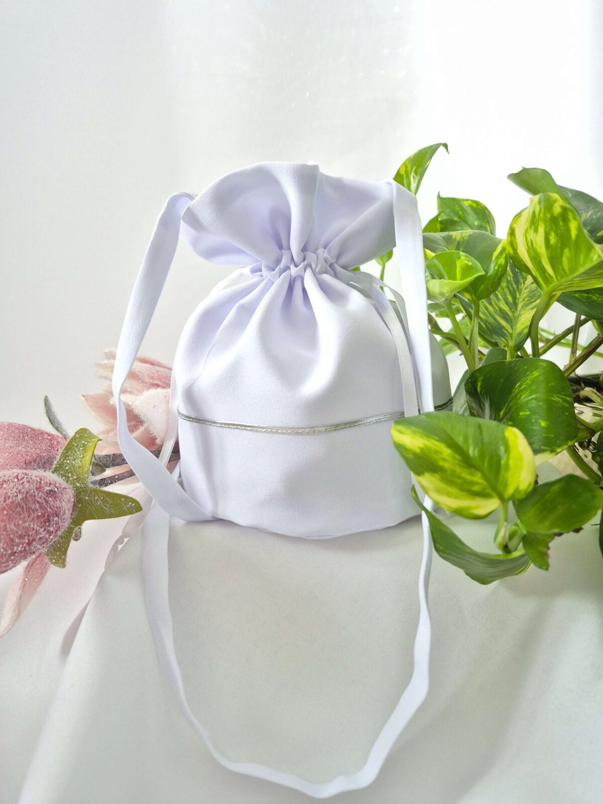 Worek uszyty jest z tej samej tkaniny, co alba (tkanina stretch). Worek pomieści książeczkę, chusteczki i różaniec oraz inne akcesoria.