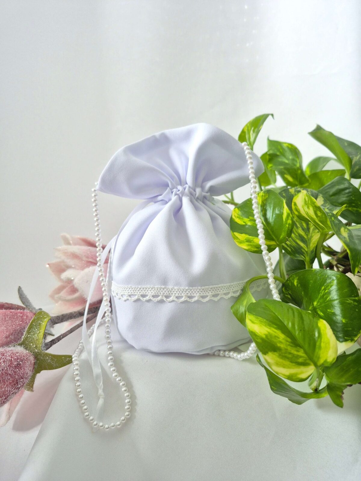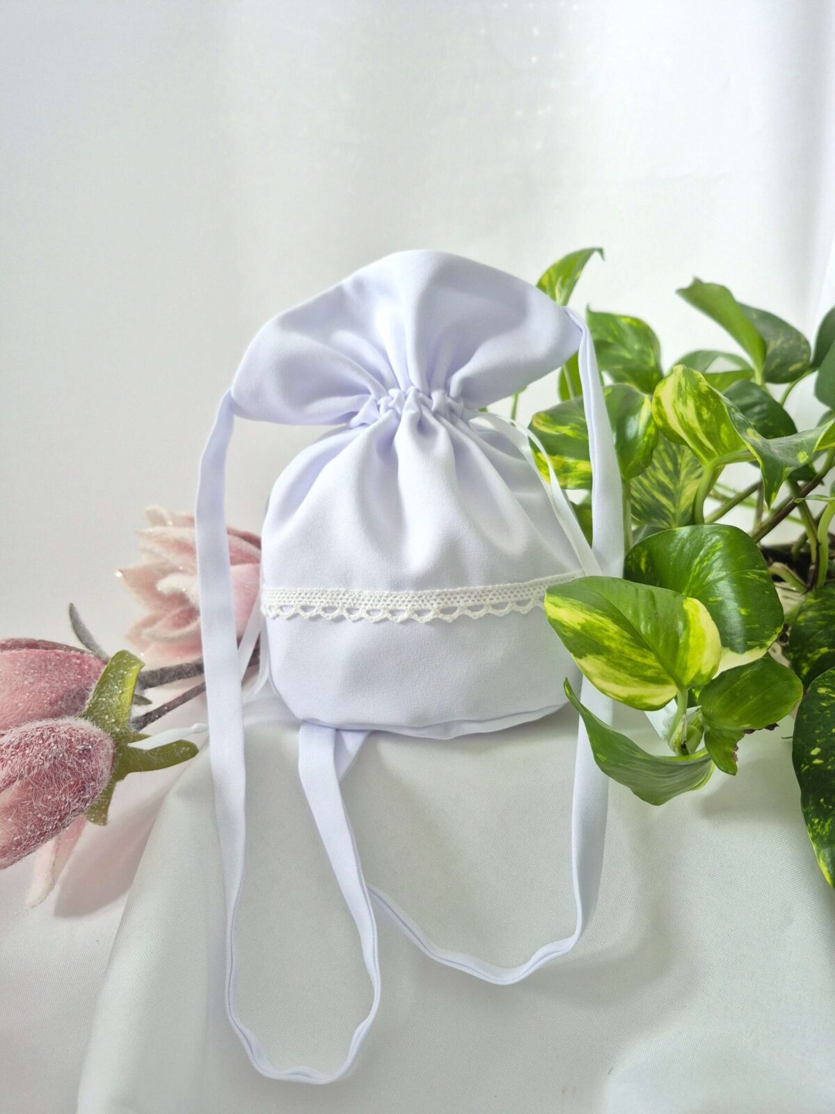 Worek uszyty jest z tej samej tkaniny, co alba (tkanina stretch). Worek pomieści książeczkę, chusteczki i różaniec oraz inne akcesoria.